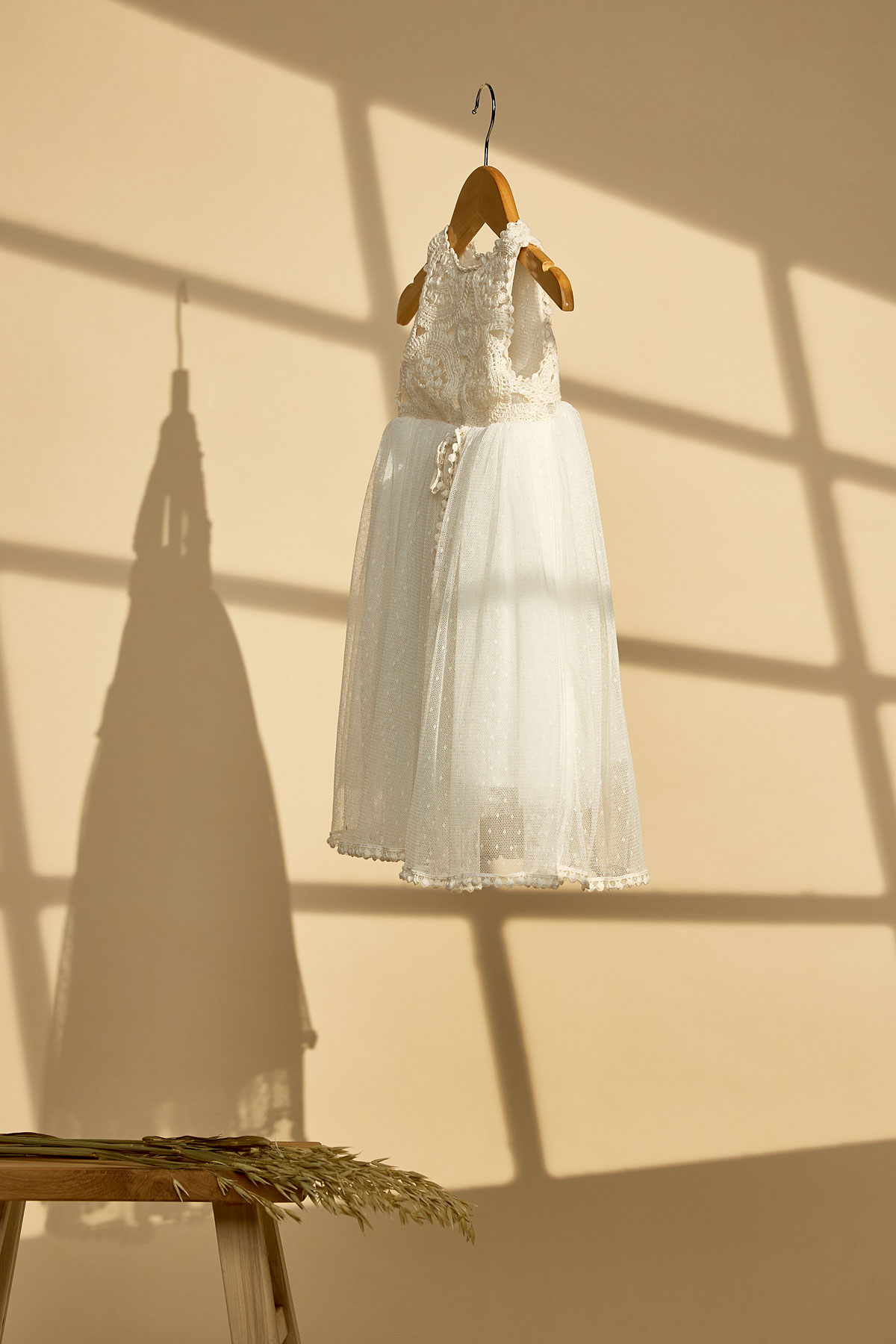 Το συγκεκριμένο βαπτιστικό φόρεμα είναι μία ρομαντική επιλογή με μία εξαιρετική στρόγγυλη δαντέλα τσιγγελάκι και παρτούς ώμους εμπρός και πίσω.Είναι μία νέα δυνατή τάση για φέτος με τα πιο ”natural” looks ,με μία αίσθηση επιστροφή στη φύση.Στο τελείωμα από το το ψιλό πουά τούλι που υπάρχει στο εσωτερικό της δαντέλας και του φορέματος στη φούστα,υπάρχει μία τρέσσα κουκουτσάκι σε εκρού χρώμα για να τονιστεί η φυσική εικόνα του φορέματος.Συνδυάστε το με τα χρυσά πέδηλα της φωτογραφίας. Στην τιμή περιλαμβάνεται και η κορδέλα για τα μαλλιά.
