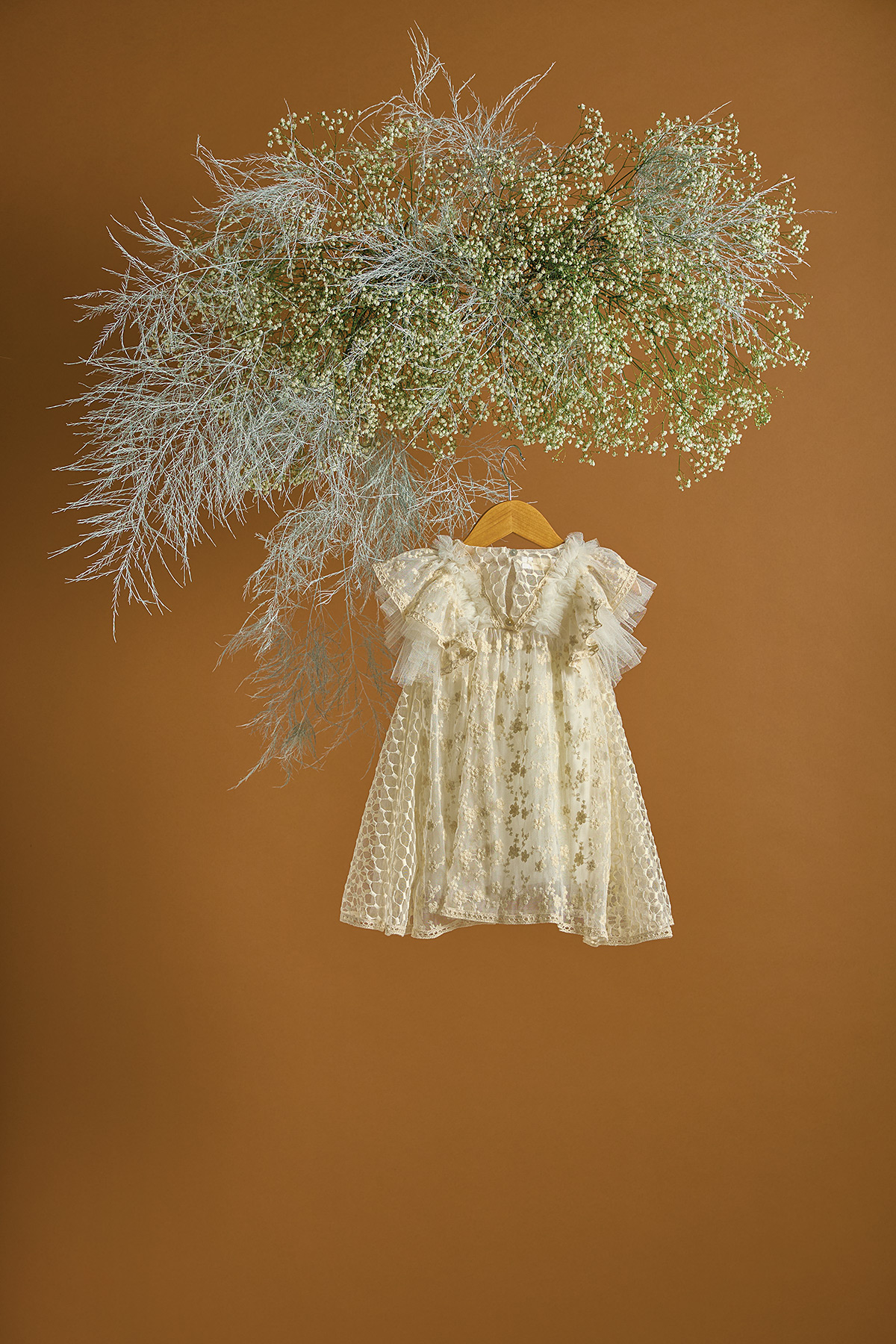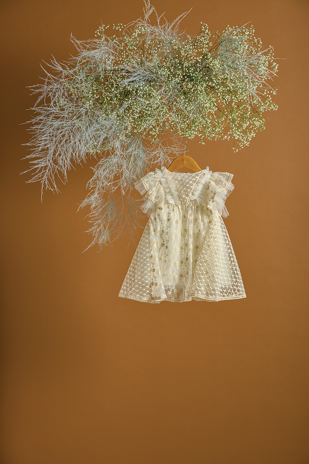 Ένα βαπτιστικό φόρεμα σε εκρού χρώμα , το οποίο έχει μία ιδιαιτερότητα. Το εξωτερικό κομμάτι είναι τουνίκ και μπορεί να φορεθεί και ξεχωριστά μετά τη βάπτιση. Φορέστε το στη μικρή σας επάνω από ένα t-shirt και από jeans.Ή ακόμα και από ένα κολάν. Η τουνίκ έχει μεγάλη κίνηση λόγω του πατρόν. Εκτός του ιδιαίτερου πατρόν του , έχουμε και συνδυασμό δύο διαφορετικών δαντελών. Αυτής των λουλουδιών και των ρόμβων. Στο τελείωμά του συναντάμε μία βαμβακερή τρ΄έσα, η οποία δημιουργεί ένα περίγραμμα στο φόρεμα ,τονίζοντας το σχήμα του. Συνδυάστε το με εκρού τσάντα και αποξηραμμένα λουλούδια του αγρού ή και μ οβάλ καπελιέρα για μία πιο κλασική επιλογή. Στην τιμή περιλαμβάνεται και η τούλινη κορδέλα για τα μαλλιά.