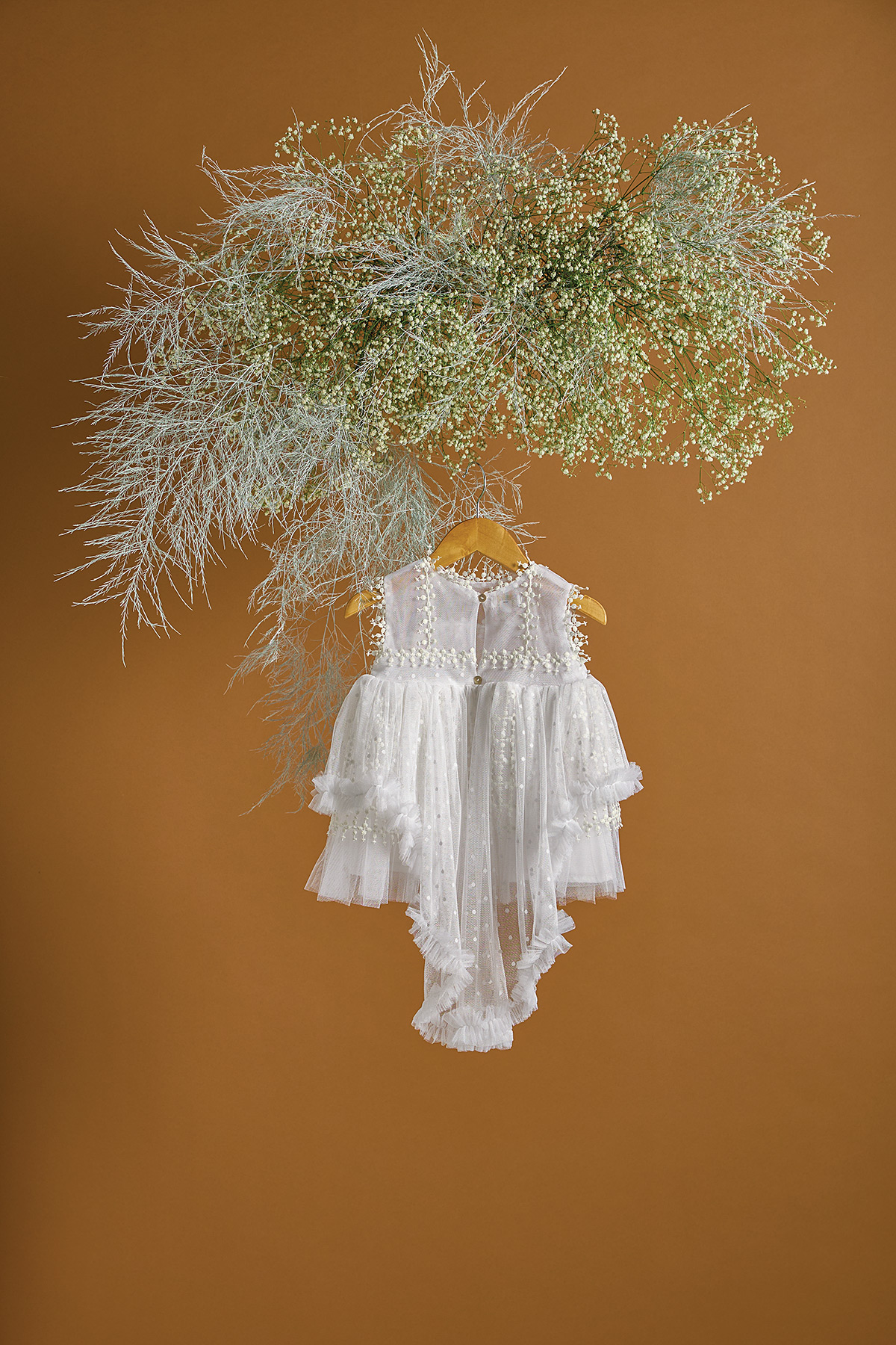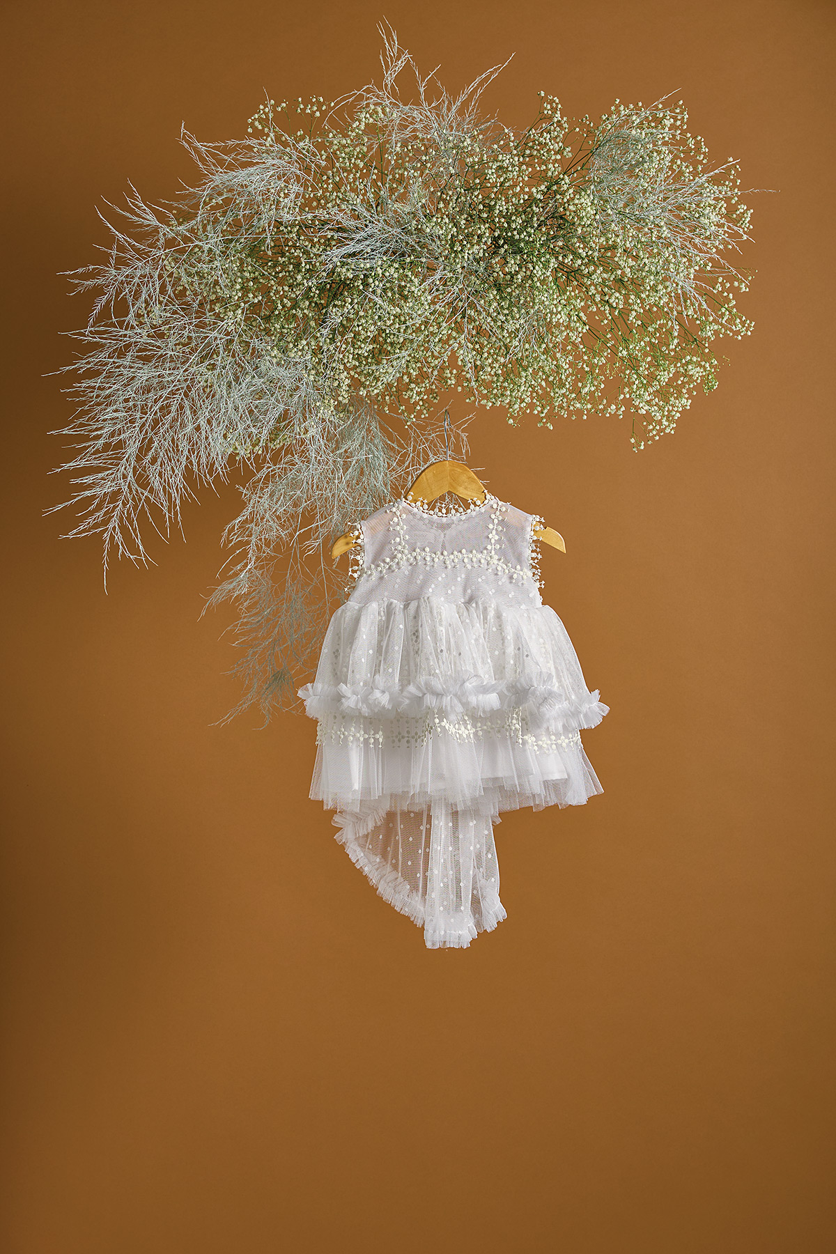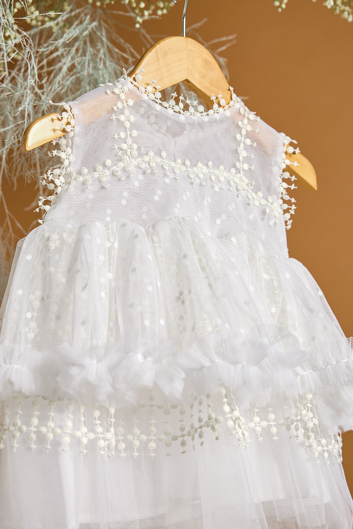 Ένα βαπτιστικό φόρεμα σε λευκό χρώμα με μια ιδιαίτερη δαντέλα γκυπούρ και πουά αγαπημένη τούλινη ουρά. Τη δαντέλα τη συναντάμε και στο μπούστο δημιουργώντας την εικόνα της τιράντας ,με την ιδιαιτερότητα ότι είναι ραμμένη επάνω στο τούλινο μπούστο. Χαρακτηριστικό του συγκεκριμένου φορέματος είναι τα layers από τούλι και από δαντέλες καθώς και η πιο ”θεατρική” ουρά από τούλι. Συνδυάστε το με λευκή καπελιέρα με αποξηραμένα λουλούδια του αγρού για ένα πιο ανεπιτήδευτο look. Στην τιμή περιλαμβάνεται και η τούλινη κορδέλα για τα μαλλιά.