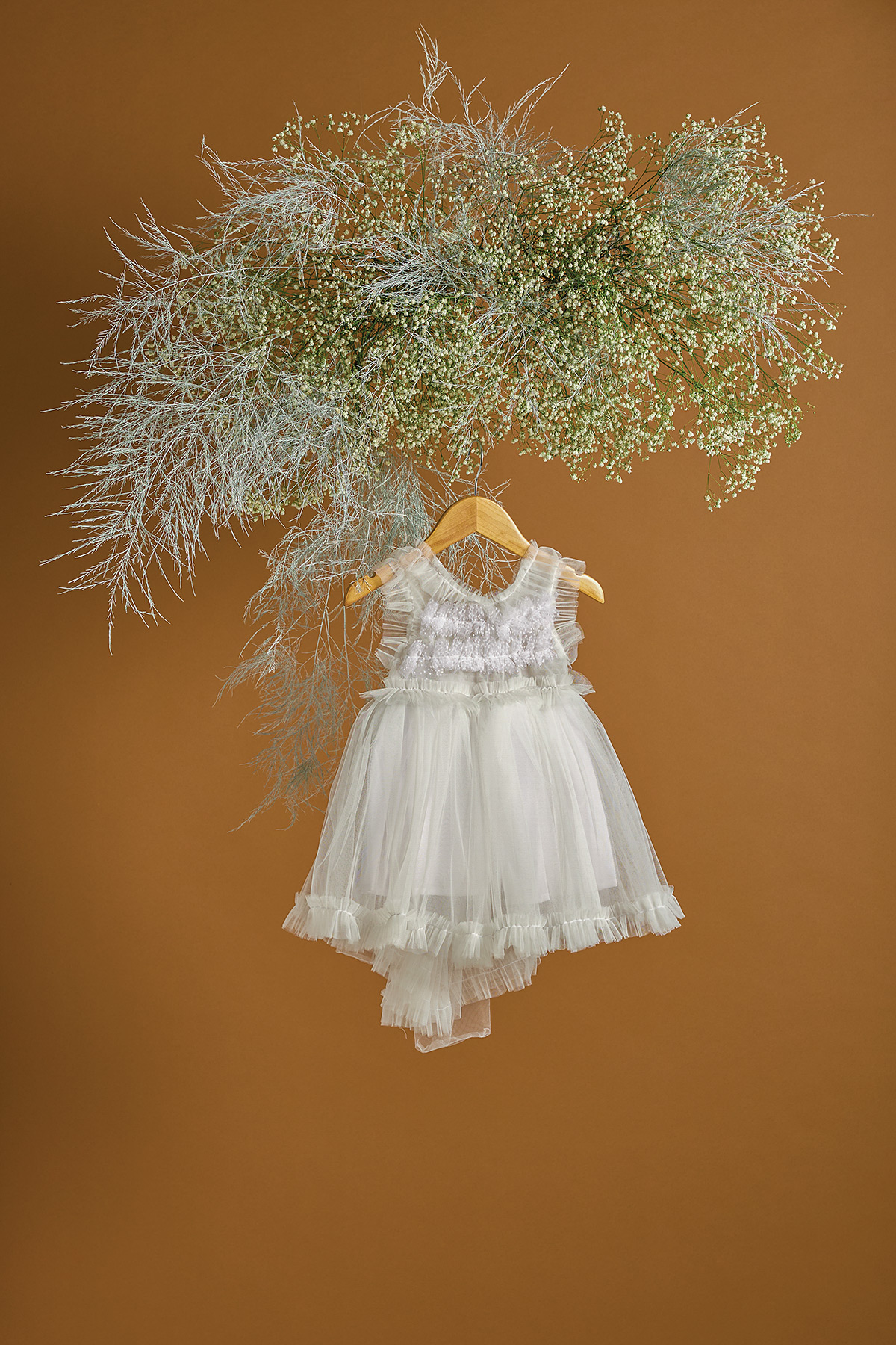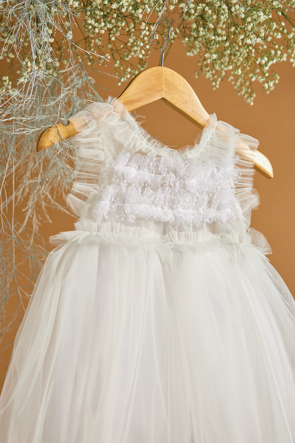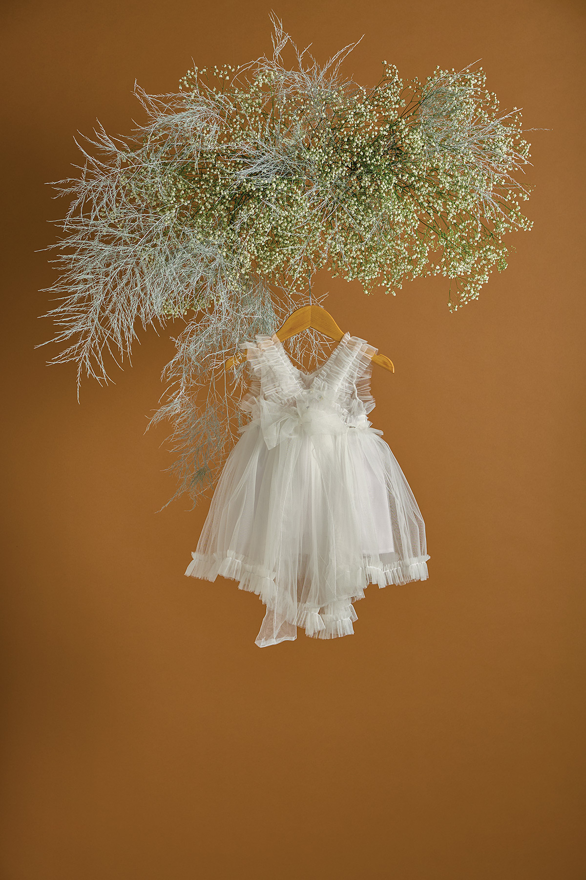Ένα βαπτιστικό φόρεμα σε λευκό χρώμα ( του πάγου ) και τρέσα πουά λευκή στο μπούστο. Η εικόνα του συγκεκριμένου βαπτιστικού φορέματος είναι ανάλαφρη χωρίς ”βαριές” δαντέλες και υπερβολές στα υφάσματα. Δημιουργείται μία ημιδιάφανη αίσθηση λόγω της χρήσης του συγκεκριμένου τουλιού ,το οποίο από μόνο του έχει έναν όγκο και μία ημιδιάφανη όψη. Ο φιόγκος στο πίσω μέρος του φορέματος ενισχύει την ανάλαφρη και ημιδιάφανη εικόνα του. Η σουρωμένη τρέσα από τούλι σε μεγάλο μέρος του φορέματος( εμπρός και πίσω) δημιουργεί ένα περίγραμμα στο πατρόν του φορέματος και προσθέτει ένταση στην τελική του εικόνα. Συνδυάστε το με λευκή καπελιέρα με στολισμό σε πομ πον ή σε πιο λιτές και αφαιρετικές επιλογές για ένα πιο λιτό και καθόλου”φλύαρο” αποτέλεσμα. Τα αποξηραμένα λουλούδια, τα χειροποίητα λουλούδια από τούλι συνδυάζονται με ανάλαφρα πομ-πον , βουάλ ημιδιάφανους φιόγκους καθώς και μεγάλα πομ-πον για να δώσουμε όση ένταση επιθυμούμε στην ολοκλήρωση του συνολικού αισθητικού αποτελέσματος του βαπτιστικού πακέτου. Στην τιμή περιλαμβάνεται και η τούλινη κορδέλα για τα μαλλιά.