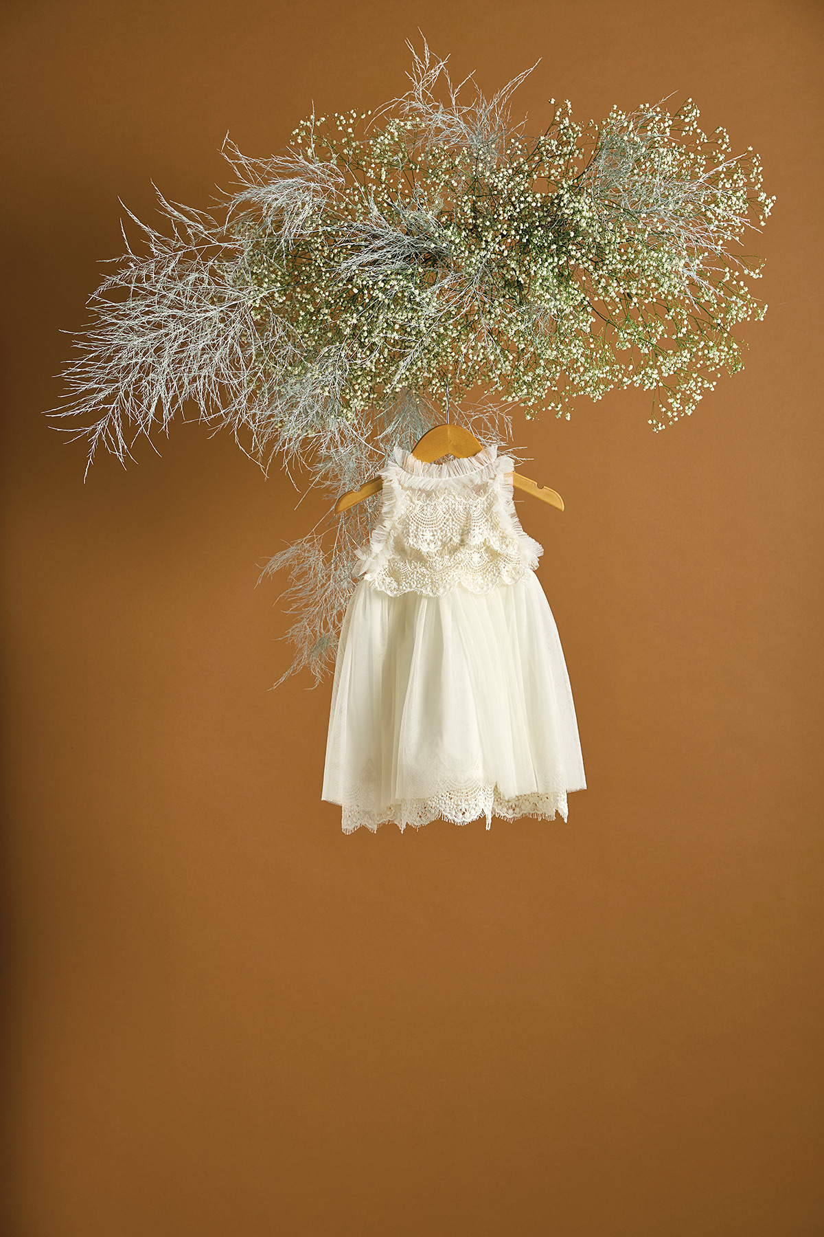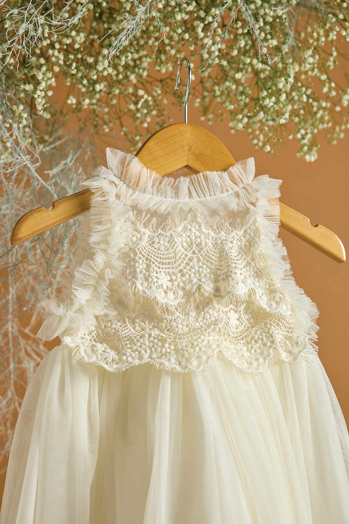 Το συγκεκριμένο βαπτιστικό φόρεμα είναι από μαλακό και αέρινο εκρού τούλι. Το μπούστο του είναι στολισμένο με ανάγλυφη δαντέλα με κουλέδες. Η αέρινη εικόνα ενισχύεται από τις τούλινες τρέσσες. Είναι σίγουρα μία ρομαντική επιλογή για την μικρή σας χωρίς υπερβολικές δαντέλες και βολάν. Στην τιμή περιλαμβάνεται η κορδέλα για τα μαλλιά.