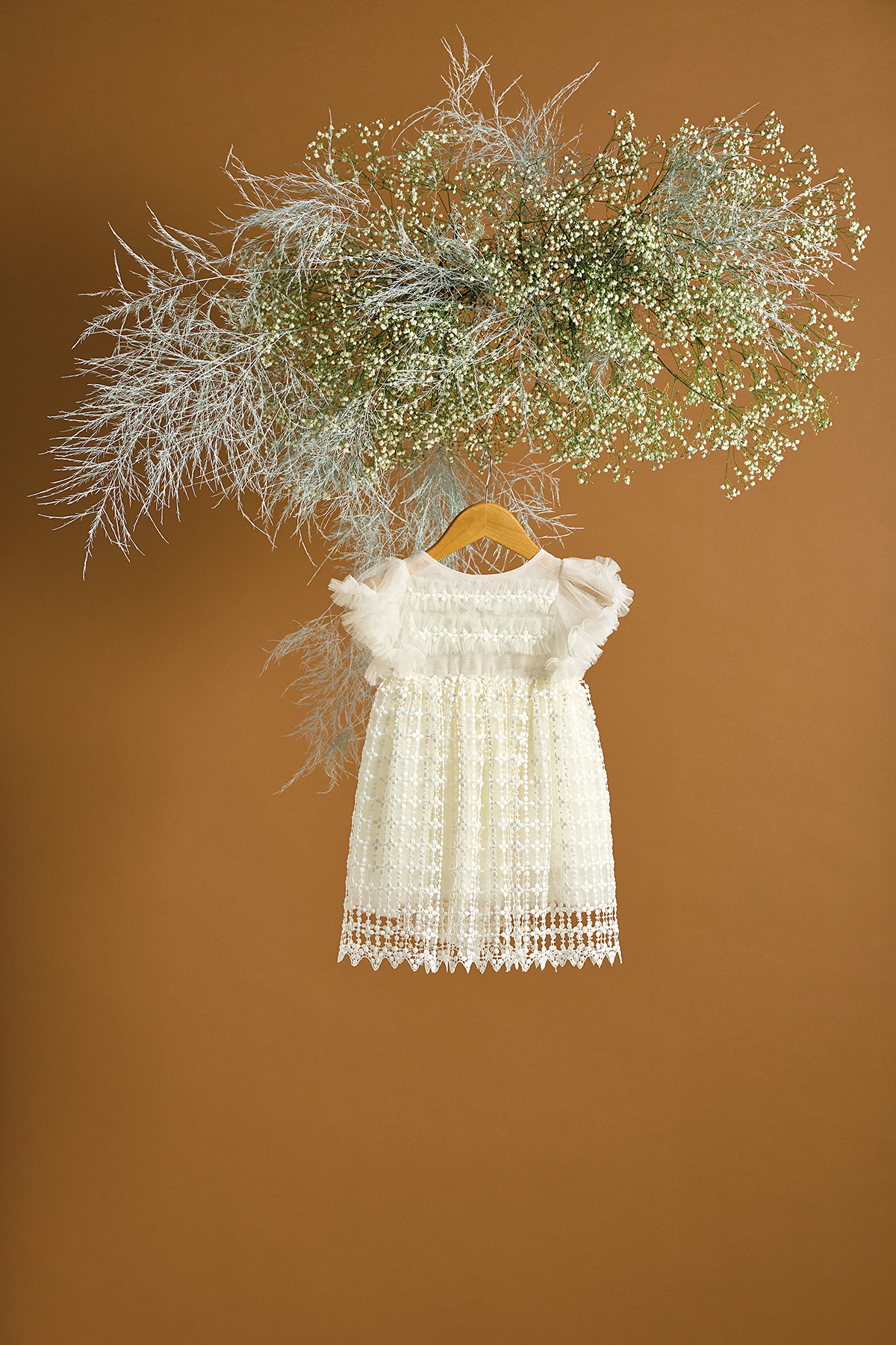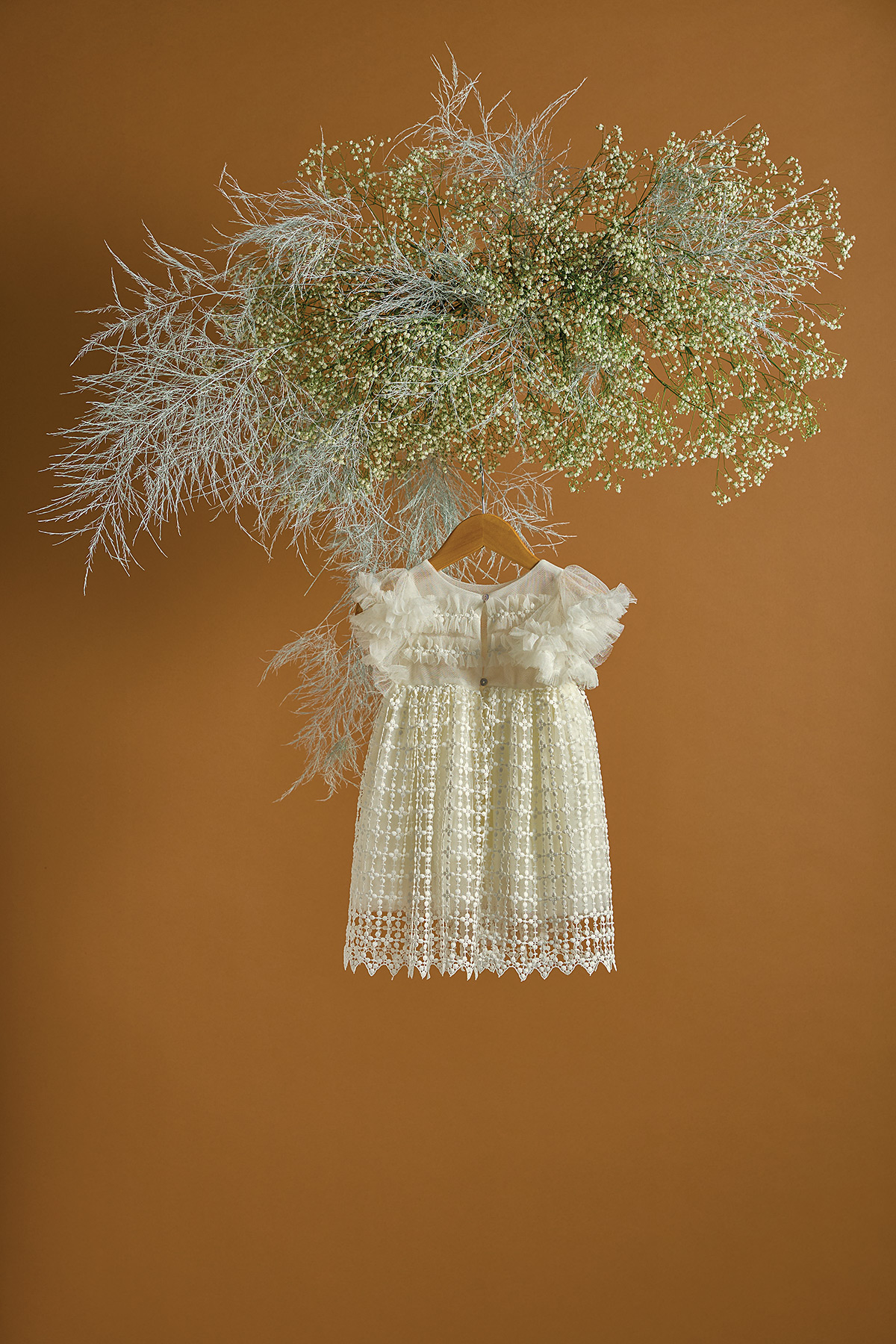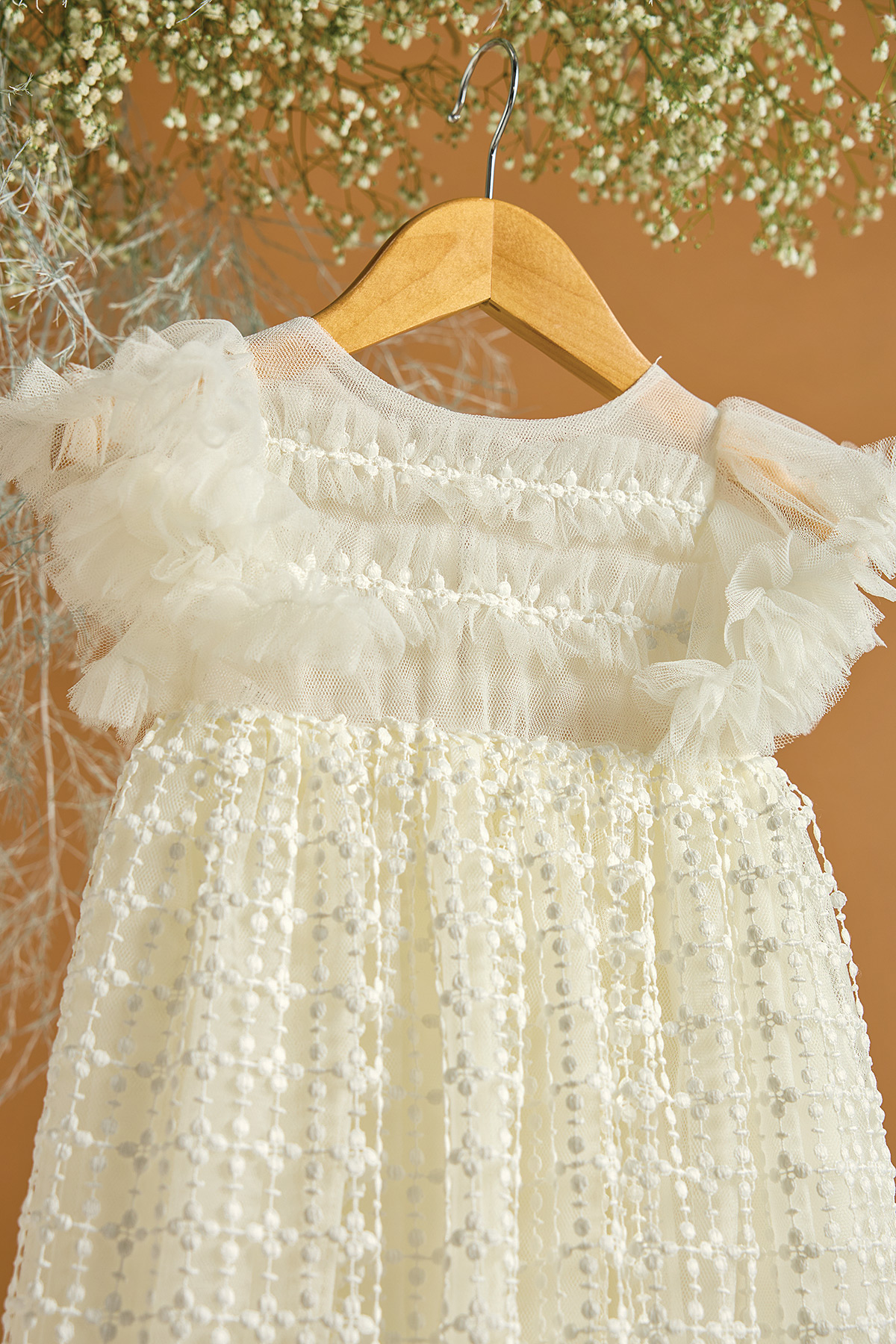Ένα βαπτιστικό φόρεμα σε υπόλευκο χρώμα με κίνηση λόγω της γκυπούρ δαντέλας. Είναι χυτή και η κίνηση τονίζει την ιδιαιτερότητά της. Τα ανάλαφρα μανίκια από τούλι τονίζονται με τις σουρωμένες τούλινες τρέσες. Συνδυάστε το με εκρού τσάντα με αποξηραμένα λουλούδια του αγρού για ένα πιο ανεπιτήδευτο αποτέλεσμα. Είναι σίγουρα μία ρομαντική επιλογή για την μικρή σας χωρίς υπερβολικό όγκο και βολάν. Στην τιμή περιλαμβάνεται η κορδέλα για τα μαλλιά.