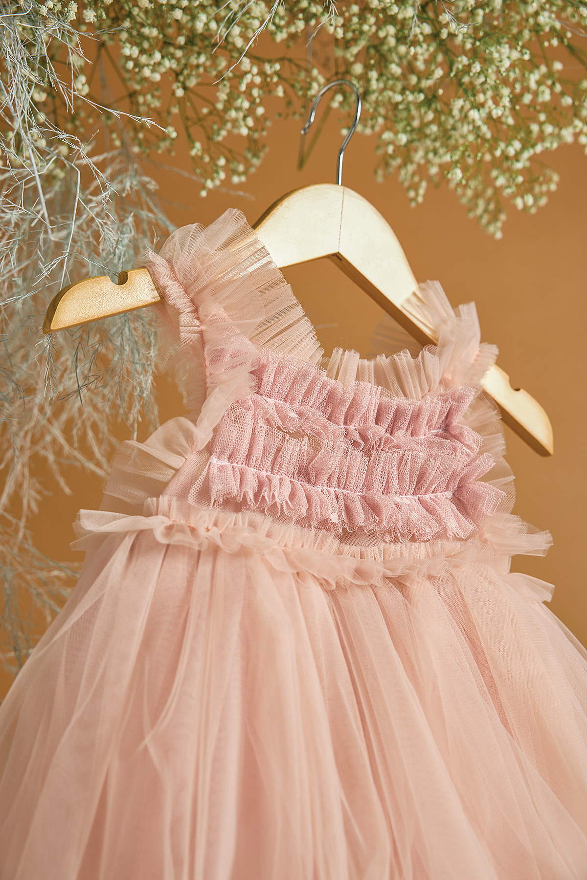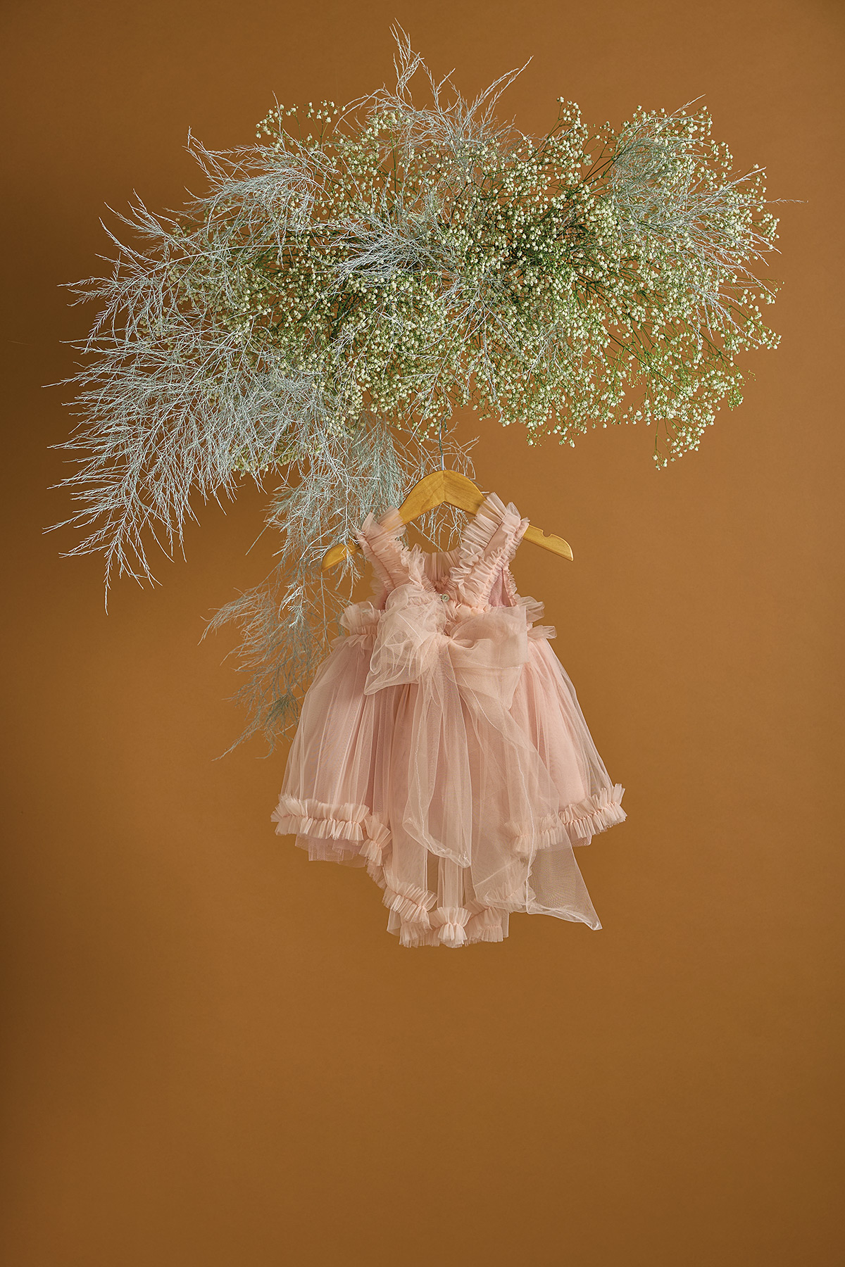 Ένα βαπτιστικό φόρεμα σε σάπιο μήλο χρώμα και τρέσα πουά σάπιο μήλο στο μπούστο. Η εικόνα του συγκεκριμένου βαπτιστικού φορέματος είναι ανάλαφρη χωρίς ”βαριές” δαντέλες και υπερβολές στα υφάσματα. Δημιουργείται μία ημιδιάφανη αίσθηση λόγω της χρήσης του συγκεκριμένου τουλιού ,το οποίο από μόνο του έχει έναν όγκο και μία ημιδιάφανη όψη. Ο φιόγκος στο πίσω μέρος του φορέματος ενισχύει την ανάλαφρη και ημιδιάφανη εικόνα του. Η σουρωμένη τρέσα από τούλι σε μεγάλο μέρος του φορέματος( εμπρός και πίσω) δημιουργεί ένα περίγραμμα στο πατρόν του φορέματος και προσθέτει ένταση στην τελική του εικόνα. Συνδυάστε το με εκρού χειροποίητη τσάντα ή καπελιέρα με στολισμό σε πομ πον ή σε πιο λιτές και αφαιρετικές επιλογές για ένα πιο λιτό και καθόλου”φλύαρο” αποτέλεσμα. Τα αποξηραμένα λουλούδια, τα χειροποίητα λουλούδια από τούλι συνδυάζονται με ανάλαφρα πομ-πον , βουάλ ημιδιάφανους φιόγκους καθώς και μεγάλα πομ-πον για να δώσουμε όση ένταση επιθυμούμε στην ολοκλήρωση του συνολικού αισθητικού αποτελέσματος του βαπτιστικού πακέτου. Στην τιμή περιλαμβάνεται και η τούλινη κορδέλα για τα μαλλιά.