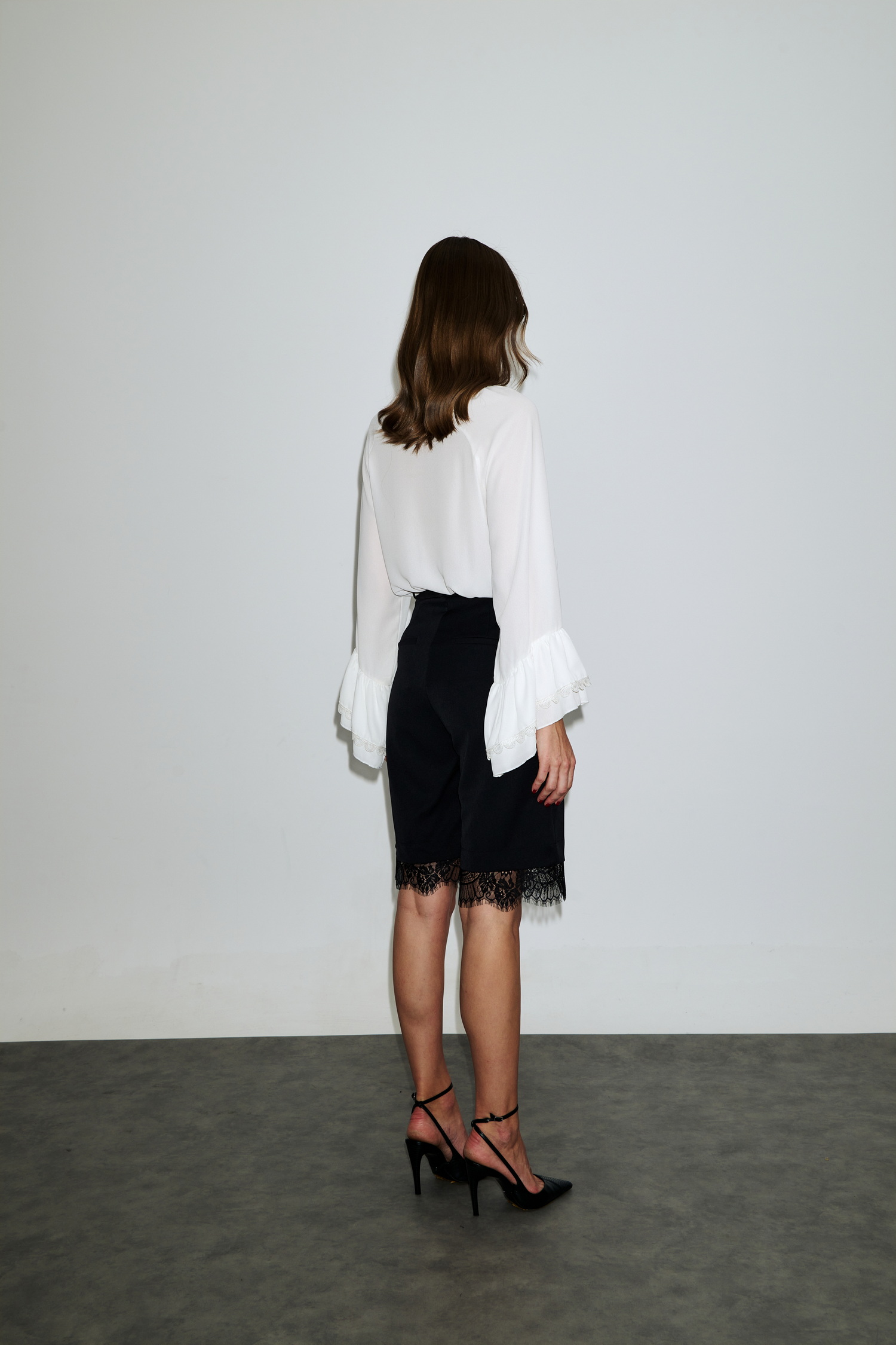 Γυναικεία βερμούδα tailored με δαντελένιο τελείωμα, για διαχρονικό και σοφιστικέ αποτέλεσμα. Ψηλόμεση, με διακοσμητικό κουμπί και λάστιχο στη μέση, ημι-φαρδιά γραμμή και ιδιαίτερη λεπτομέρεια με μαύρη φαρδιά δαντέλα στο τελείωμα.