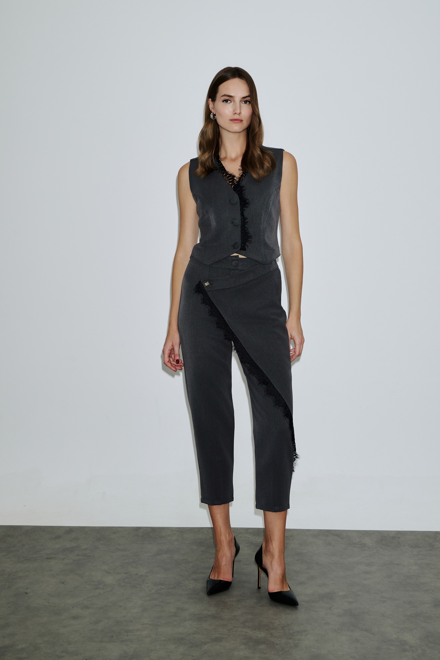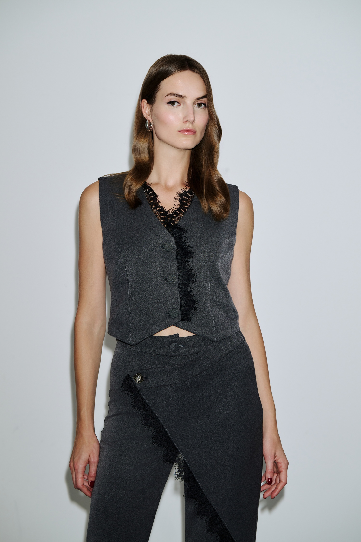 Γιλέκο σε tailored γραμμή με κουμπιά μπροστά και εντυπωσιακή λεπτομέρεια με μαύρη δαντέλα κατά μήκος πατιλέτας και V λαιμόκοψης.