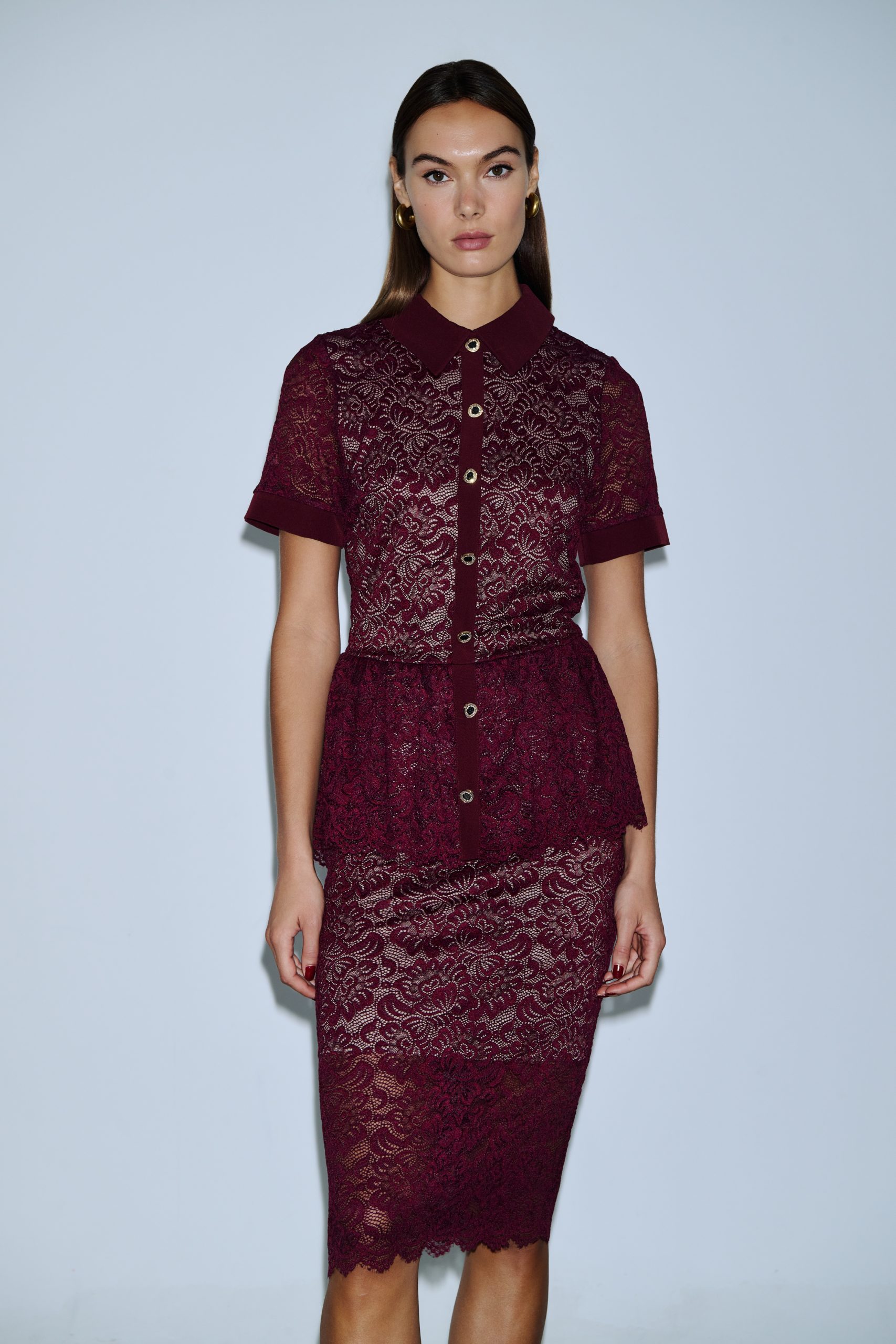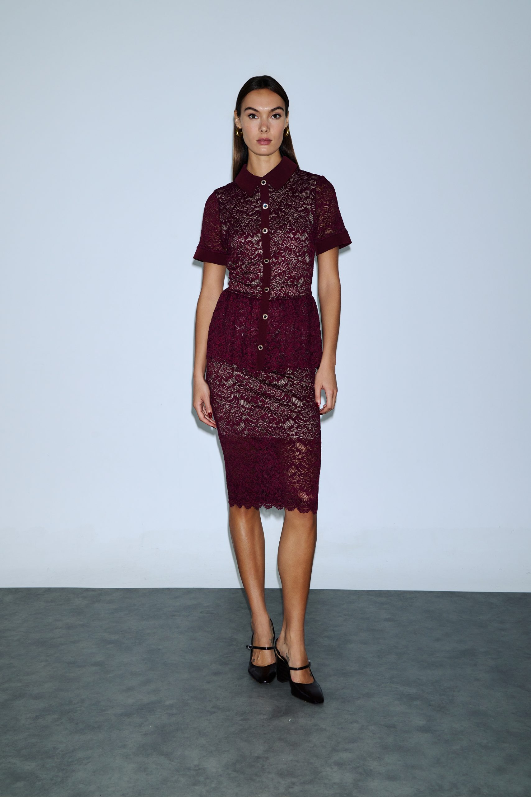 Δαντελένιο pencil φόρεμα midi μήκους με γιακά και διακοσμητικά κουμπιά μπροστά. Το έντονο, φλοράλ μοτίβο της δαντέλας και ο ελαφρώς peplum σχεδιασμός στη μέση δημιουργούν φινετσάτο αποτέλεσμα, ενώ το διαφανές ύφασμα αφήνει διακριτικά το δέρμα να φανεί.