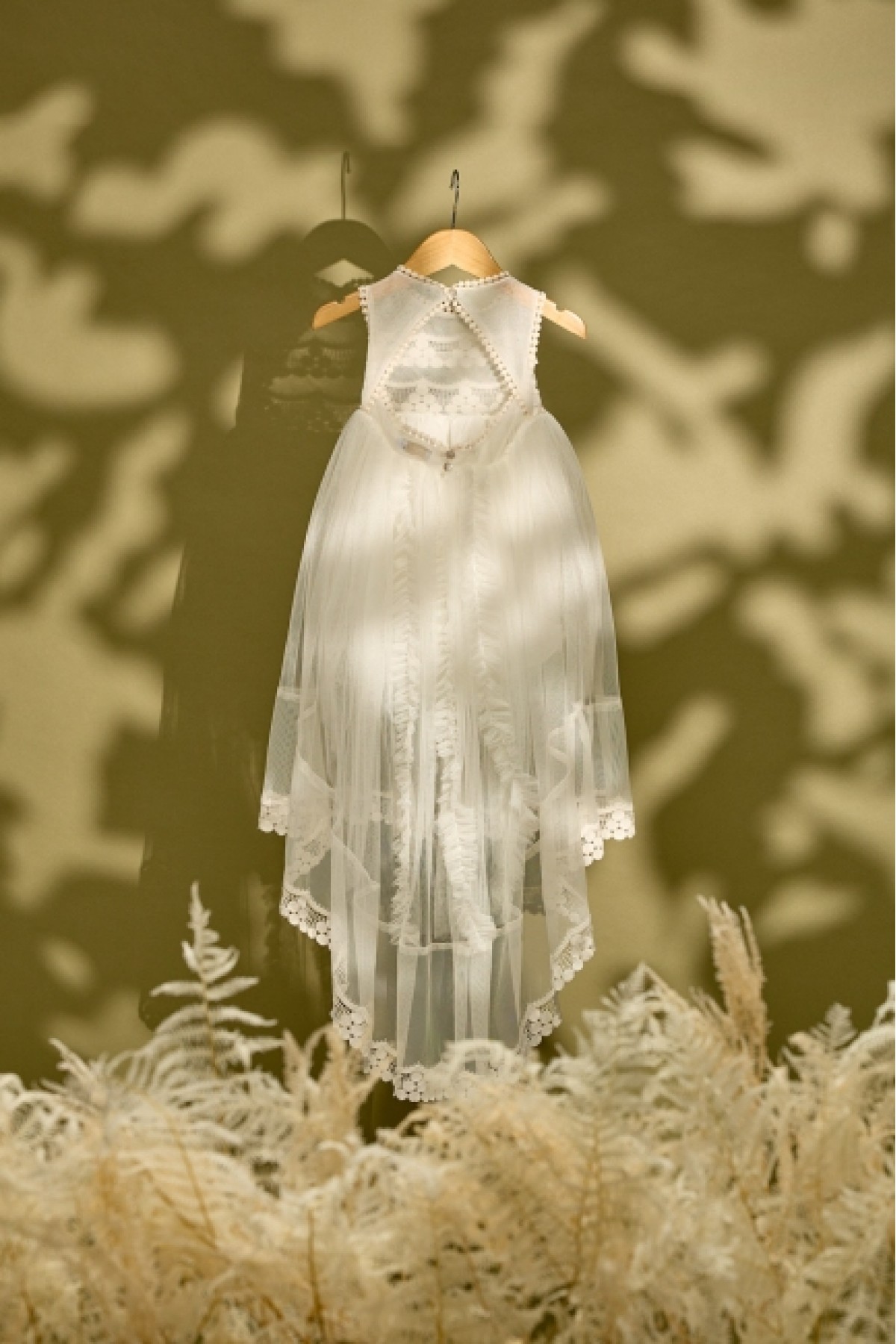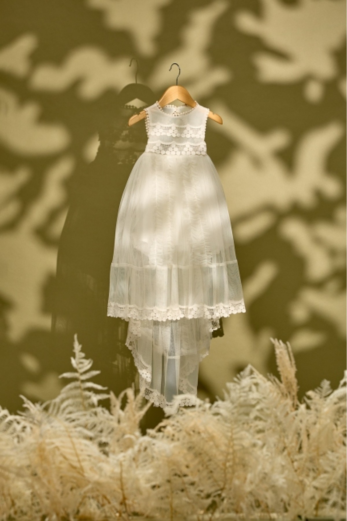 Ένα βαπτιστικό φόρεμα σε εκρού χρώμα με ιδιαίτερη δαντέλα που θυμίζει το σταφύλλι.Έχει ουρά από τούλικαι έντονες λεπτομέρεις από τούλινες τρέσσες σε μαλακή υφή. Συνδυάζεται με δερμάτινα πέδηλα σε χρυσό και με εκρού ή σάπιο μή΄λο μπαλαρίνες.