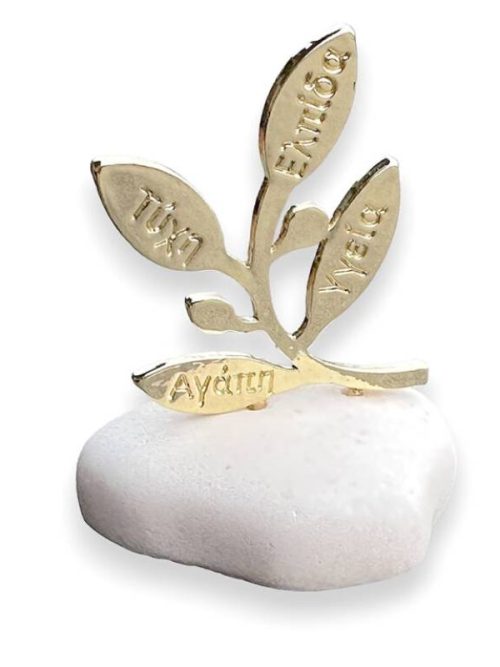 Μπομπονιέρα διακοσμητικό σε βάση από απομίμηση βότσαλου, με μεταλλικό στοιχείο Κλαδί Ελιάς, σε 2 χρώματα.