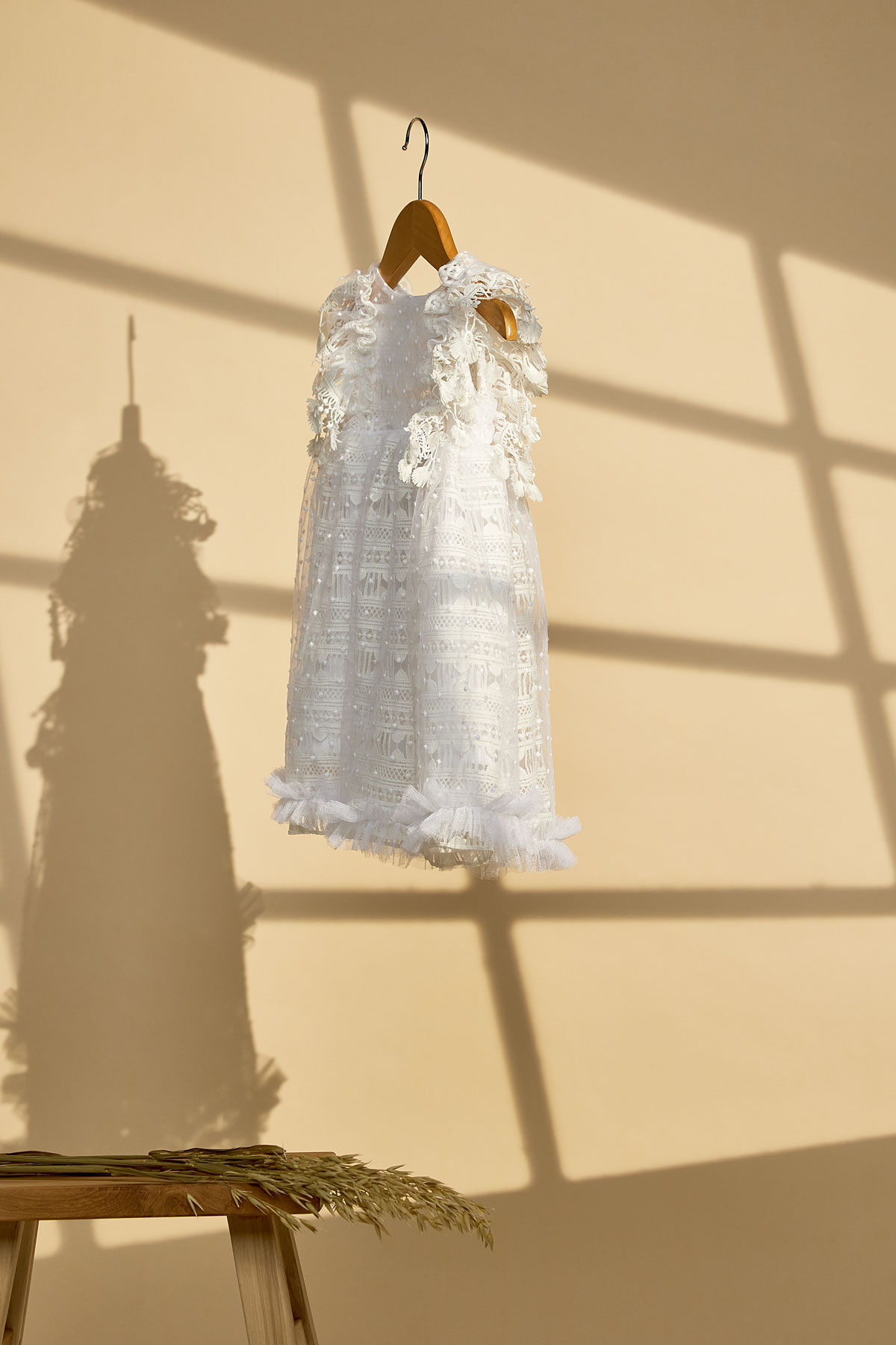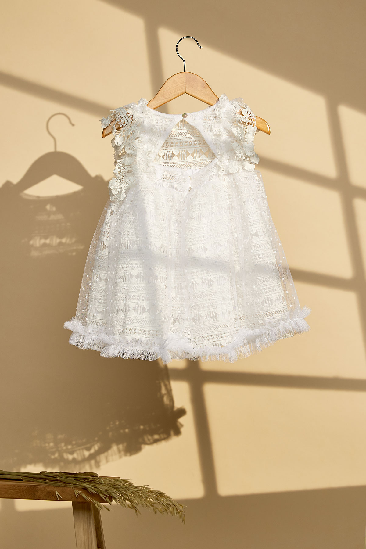 Ένα βαπτιστικό φόρεμα σε λευκό χρώμα με γεωμετρική δαντέλα και πουά κεντημένο ανάγλυφο τούλι. Συνδυάζεται με δερμάτινα πέδηλα σε χρυσό ή ασημί ή και με λευκές μπαλαρίνες.