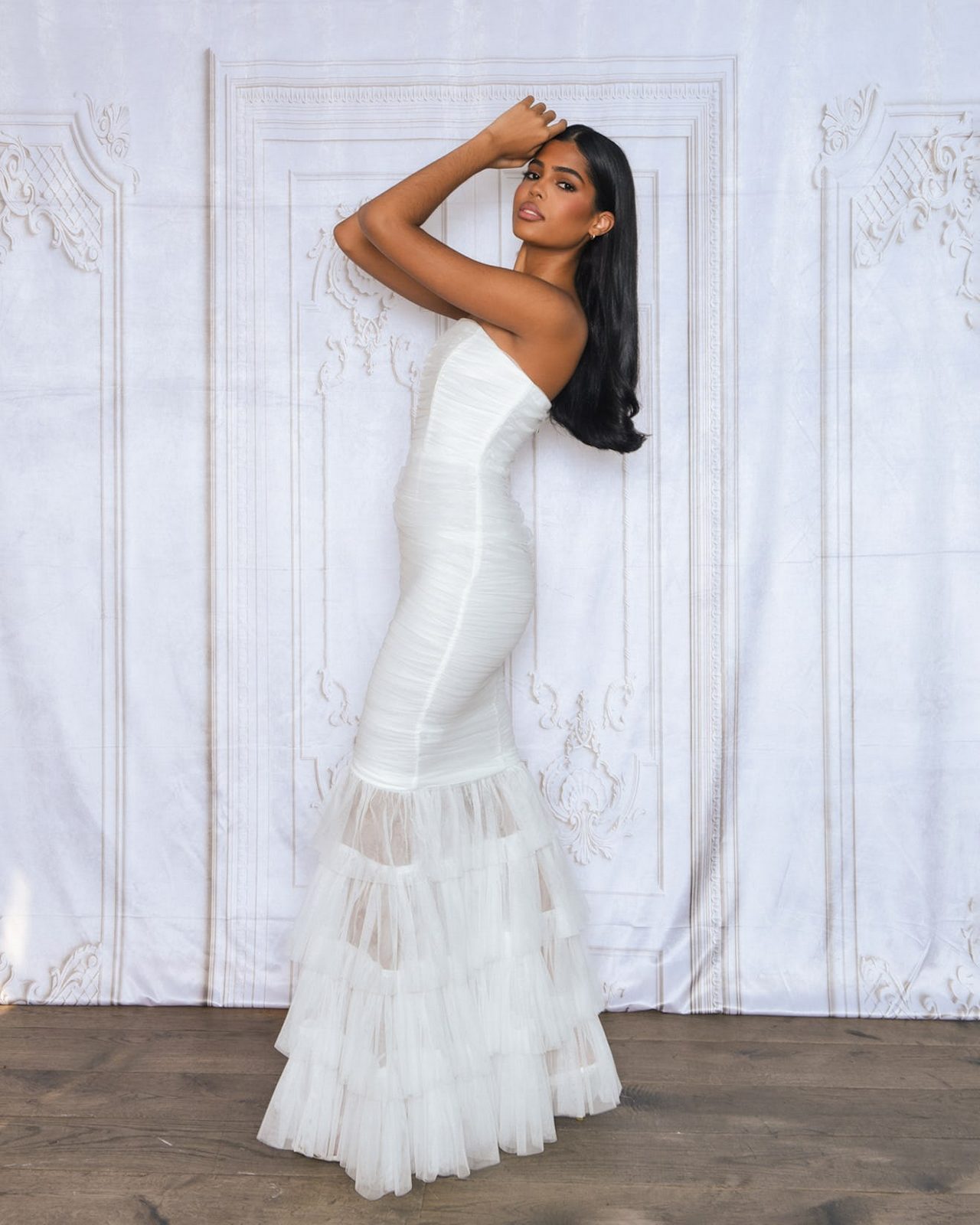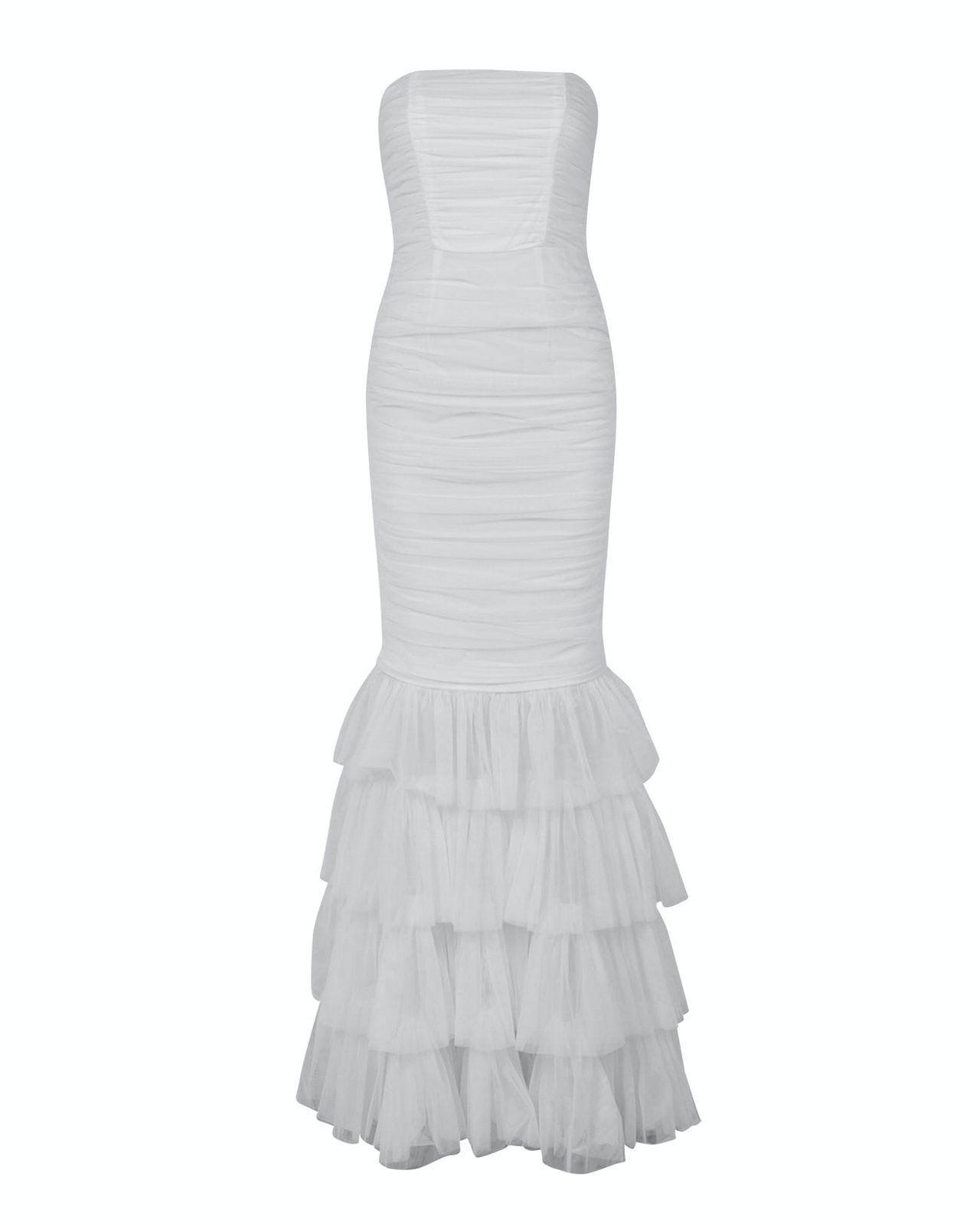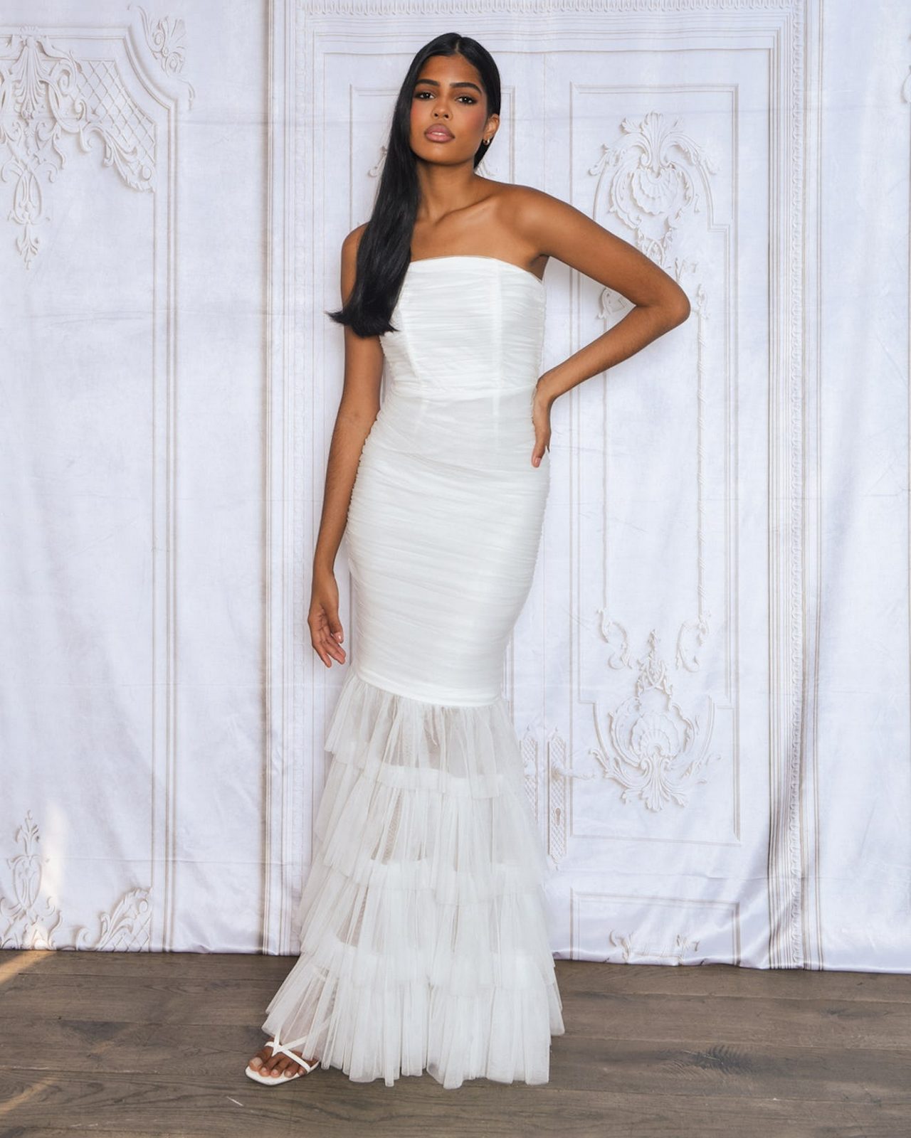 Λευκό bandeau γοργονέ μάξι φόρεμα με ύφασμα από τούλι και αποσπώμενο το κάτω κομμάτι με τα βολάν.