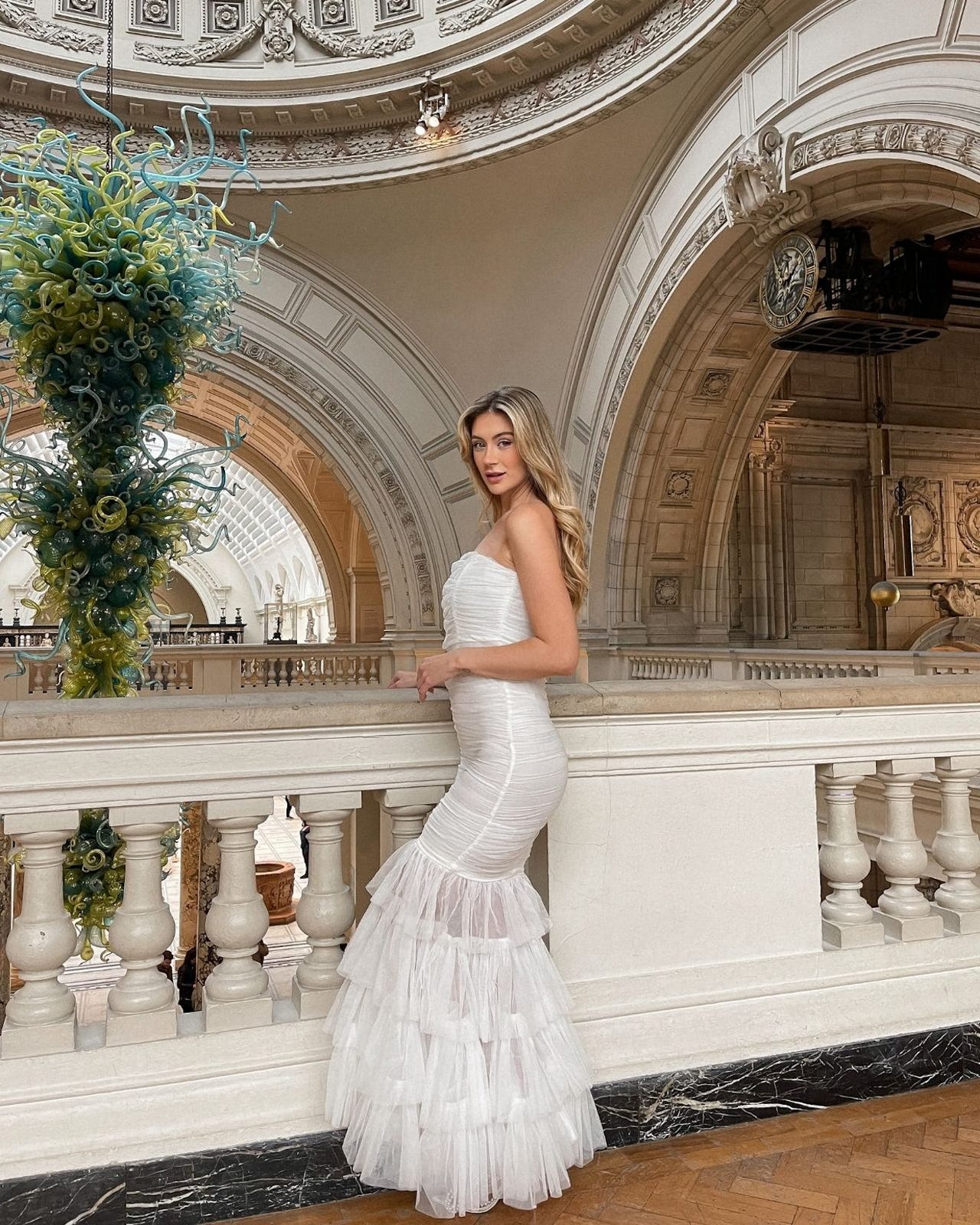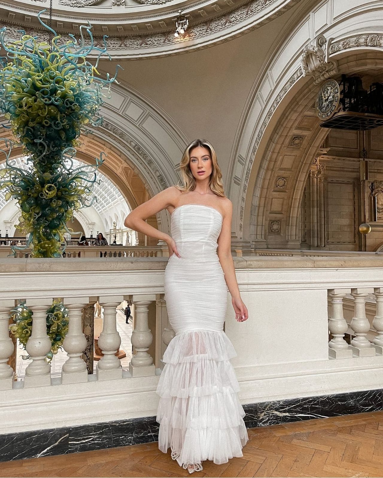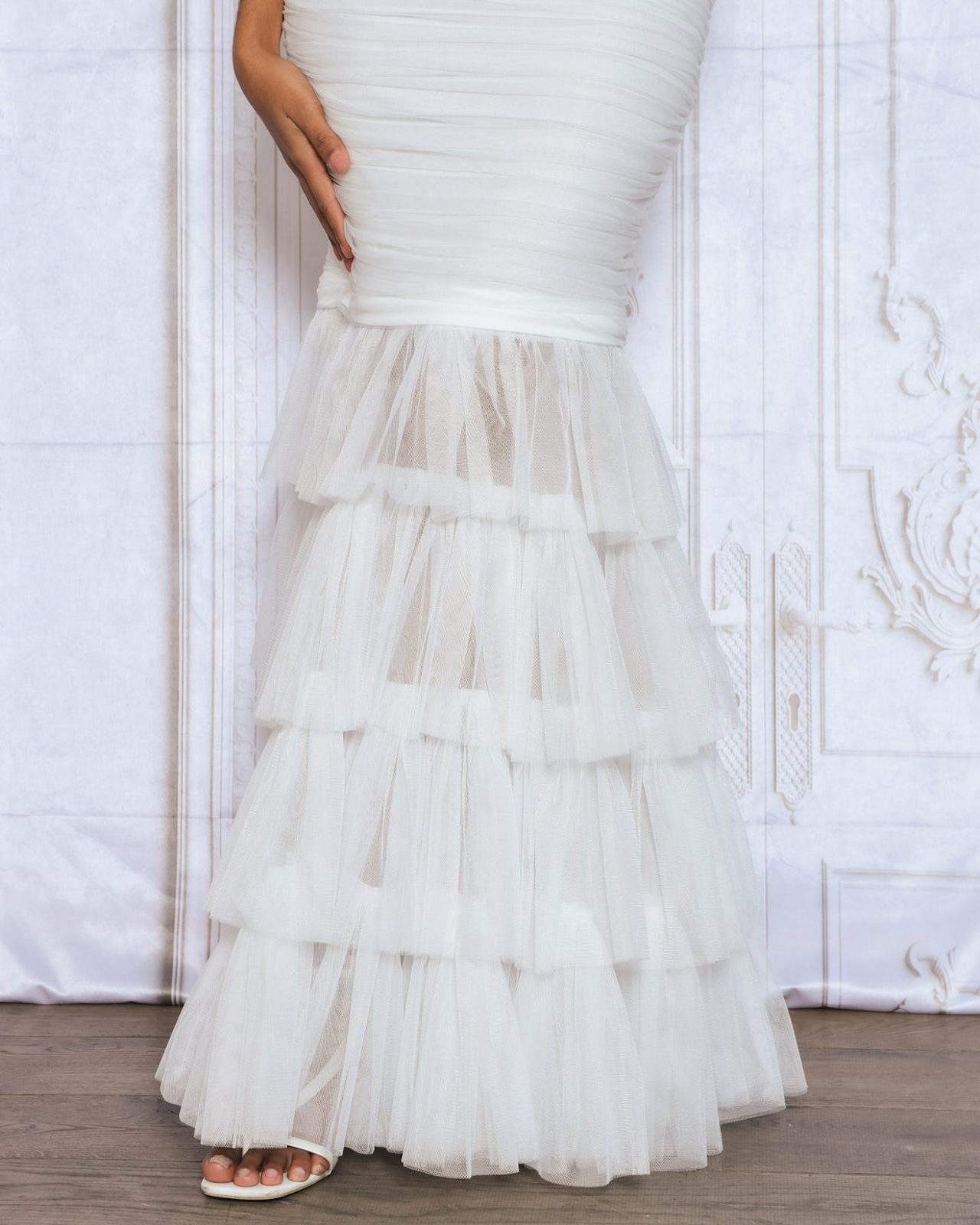 Λευκό bandeau γοργονέ μάξι φόρεμα με ύφασμα από τούλι και αποσπώμενο το κάτω κομμάτι με τα βολάν.