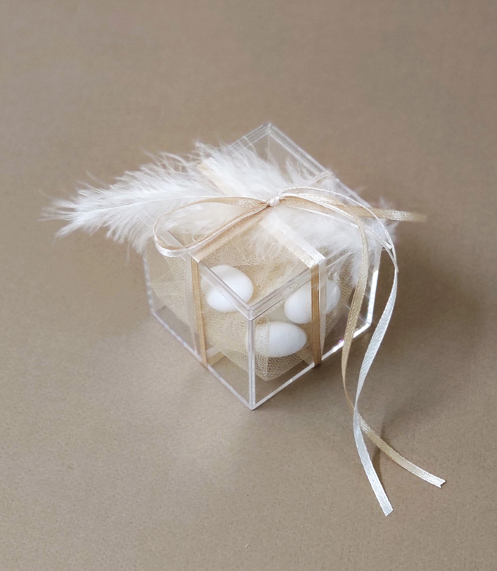 Μπομπονιέρα γάμου διάφανο κουτί με λευκό πούπουλο και σατέν κορδέλες σε εκρού και σοκολά χρώμα. Εσωτερικά περιέχει σοκολά τούλι με 5 κουφέτα