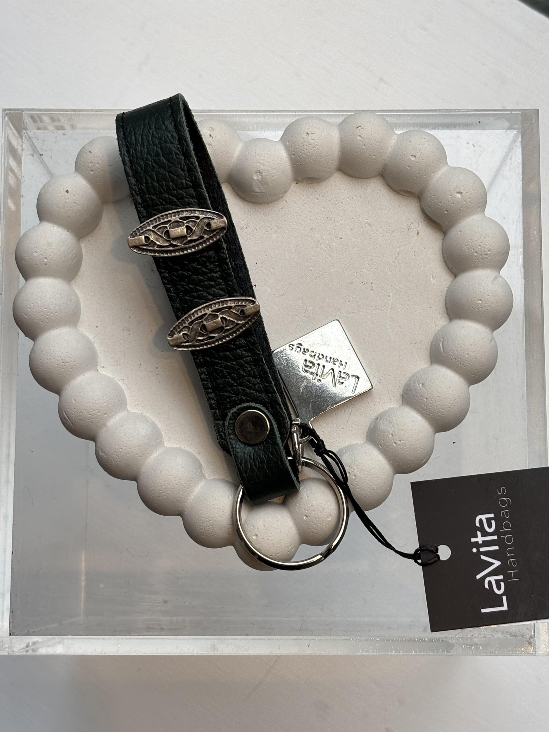 Χειροποίητο δερμάτινο μπρελόκ με μεταλλικά αξεσουάρ.