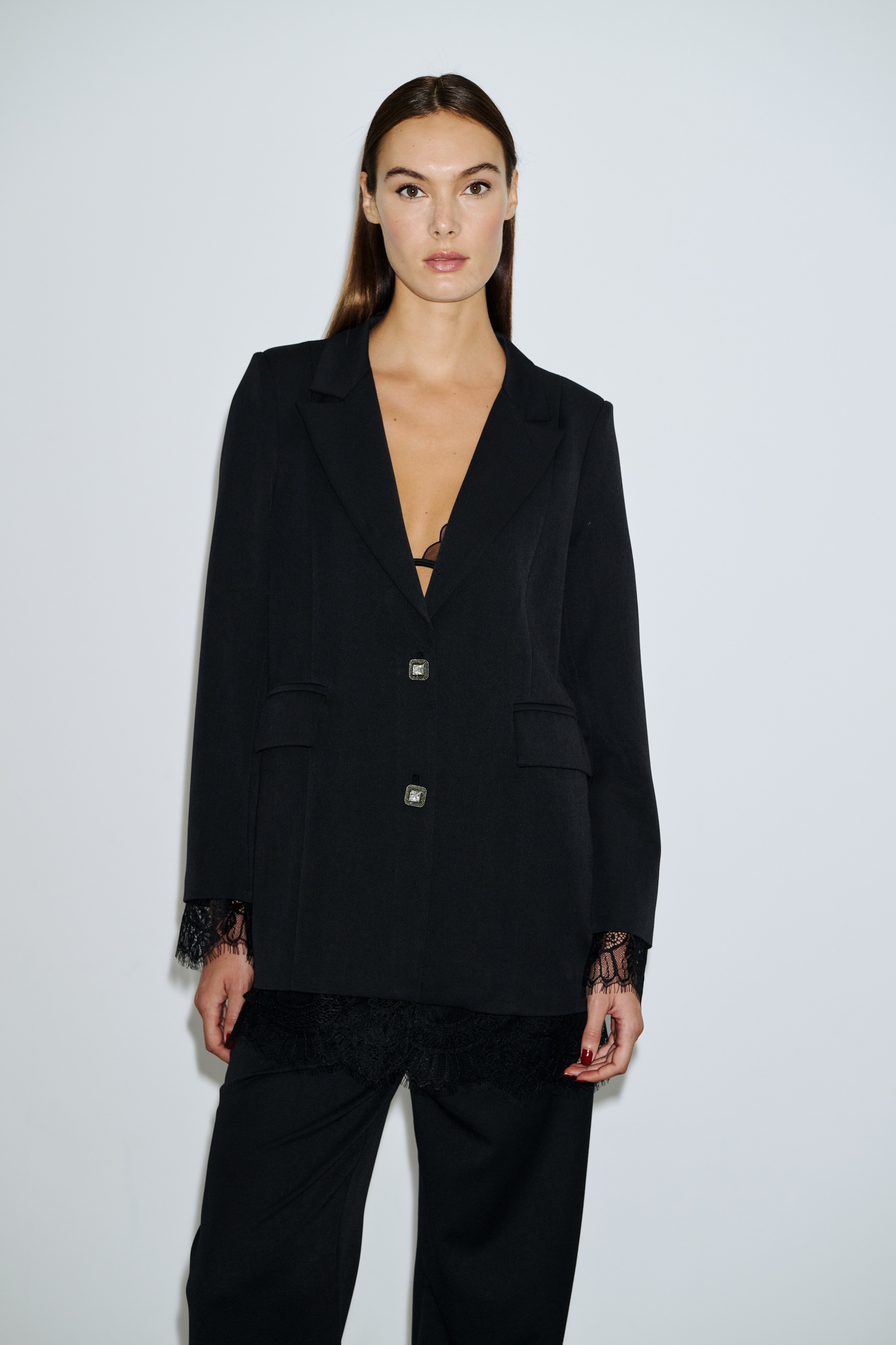 Σακάκι ανδρικής αισθητικής με διακοσμητικά κουμπιά, ίσια γραμμή και ιδιαίτερες λεπτομέρειες από δαντέλα στα τελειώματα των μανικιών και το στρίφωμα. Κλασικός γιακάς, τσέπες με καπάκι και μακρύ μήκος για extra chic αποτέλεσμα.