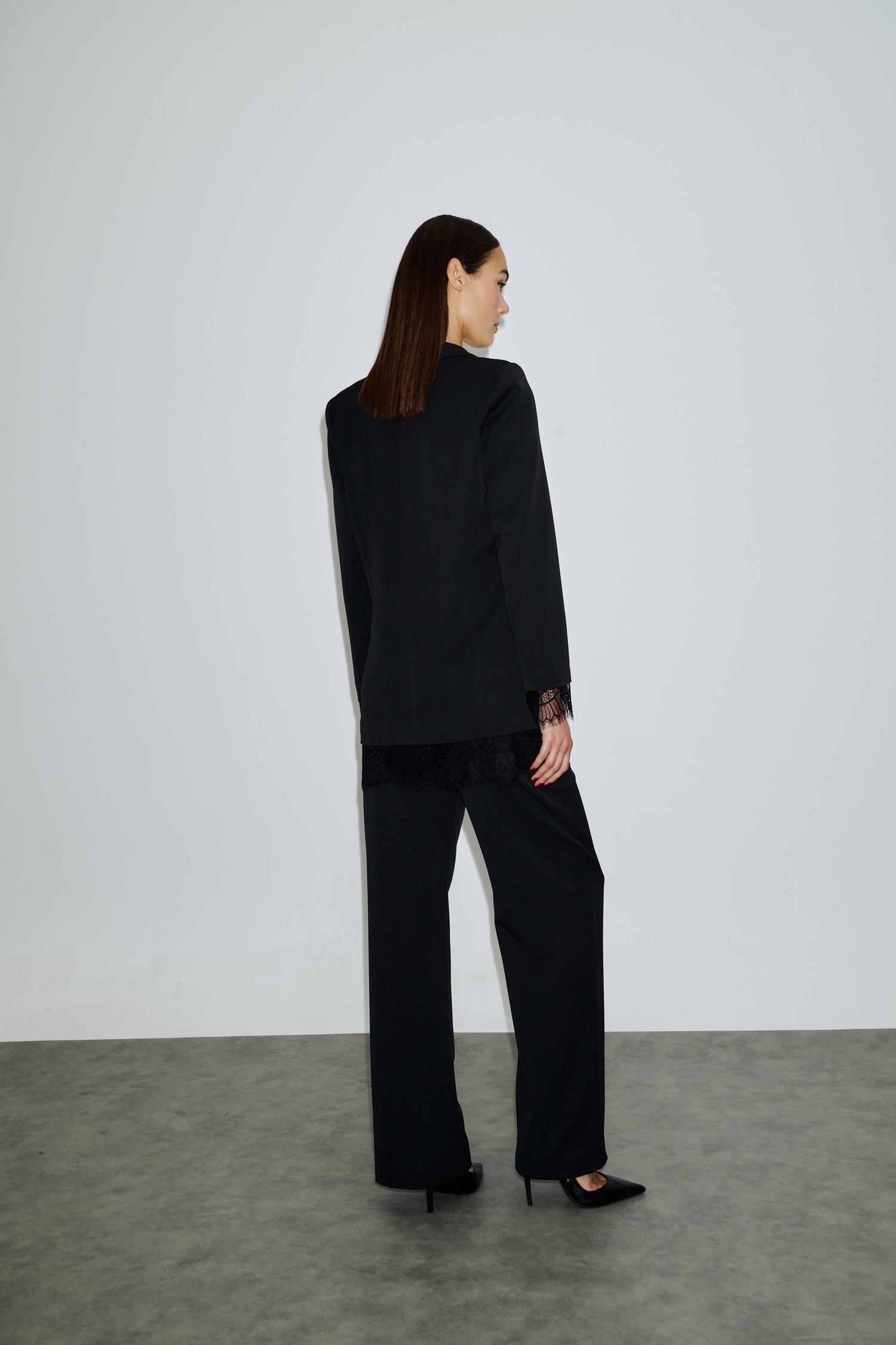Ψηλόμεσο cigarette παντελόνι σε μαύρο χρώμα με ιδιαίτερη wrap όψη και διακοσμητική λεπτομέρεια δαντέλας στη λοξή πατιλέτα. Μίνιμαλ σχεδιασμός με μοντέρνο φινίρισμα, ιδανικό για day-to-night εμφανίσεις.