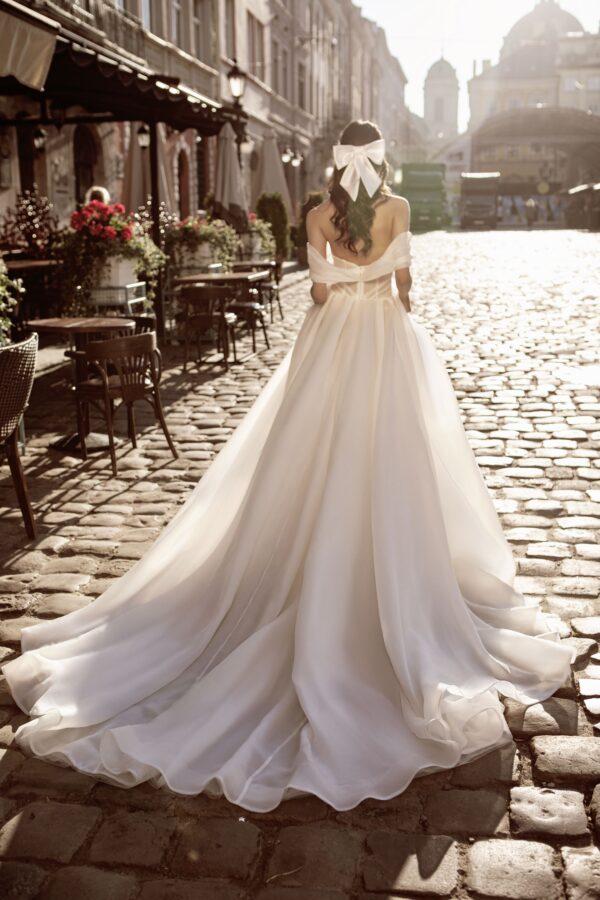Aέρινο νυφικό με υπέροχη φούστα με άνοιγμα στο πόδι που ολοκληρώνουν τον αριστοκρατικό και φινετσάτο χαρακτήρα του νυφικού.