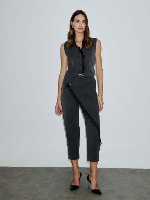 Ψηλόμεσο cigarette παντελόνι σε μαύρο χρώμα με ιδιαίτερη wrap όψη και διακοσμητική λεπτομέρεια δαντέλας στη λοξή πατιλέτα. Μίνιμαλ σχεδιασμός με μοντέρνο φινίρισμα, ιδανικό για day-to-night εμφανίσεις.