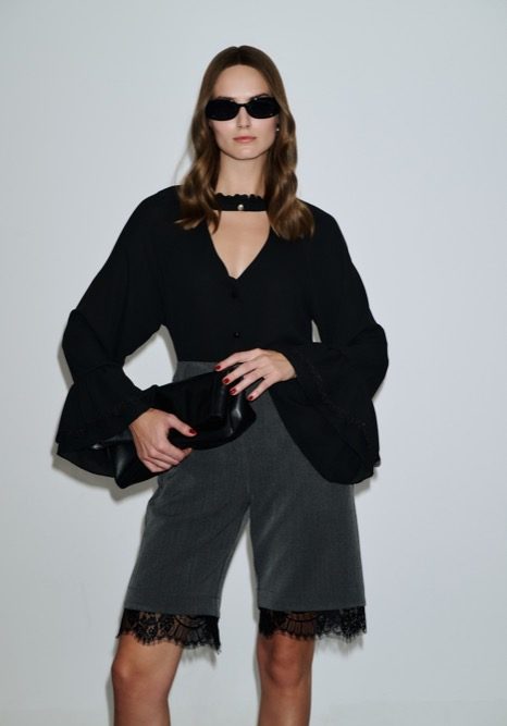 Γυναικεία βερμούδα tailored με δαντελένιο τελείωμα, για διαχρονικό και σοφιστικέ αποτέλεσμα. Ψηλόμεση, με διακοσμητικό κουμπί και λάστιχο στη μέση, ημι-φαρδιά γραμμή και ιδιαίτερη λεπτομέρεια με μαύρη φαρδιά δαντέλα στο τελείωμα.