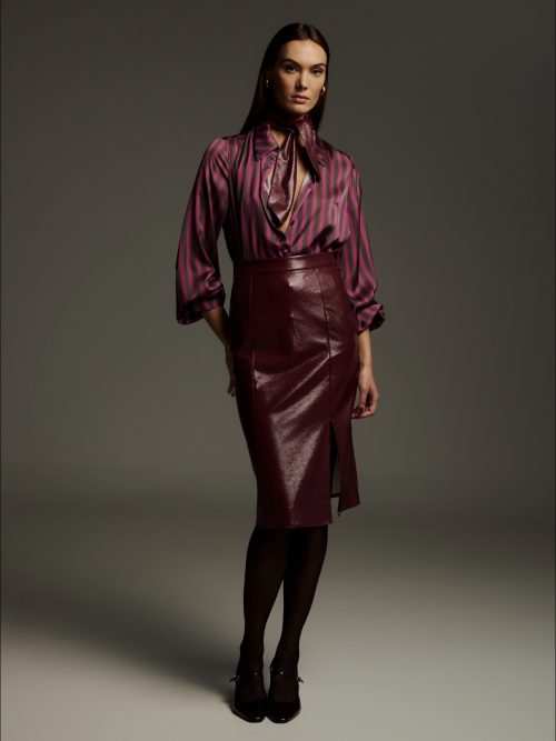 Ψηλόμεση pencil φούστα από δερματίνη,με μήκος μέχρι το γόνατο και στενή εφαρμογή που αναδεικνύει τη σιλουέτα. Το σχέδιο είναι μίνιμαλ και καθαρό, με clean cut γραμμές και διακριτική ραφή στο πίσω μέρος για άνεση.