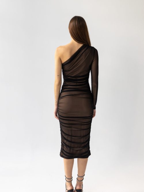Μίντι φόρεμα από τούλινο ύφασμα, με έναν ώμο ,το οποίο δεν τσαλακώνεται.