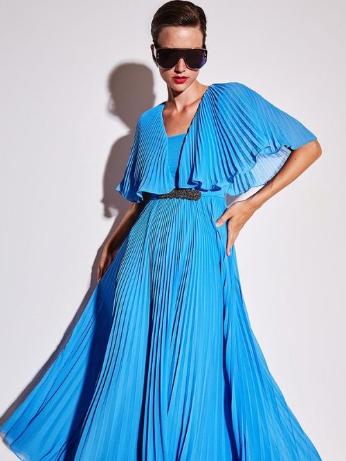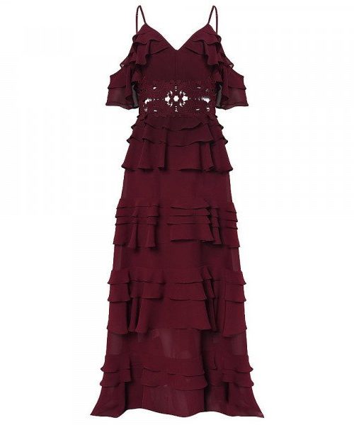 Μπορντό μάξι φόρεμα με βολάν kai V μπροστά