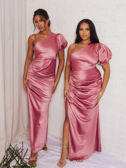 Σατέν Ροζ Μάξι Φόρεμα Με Ένα Μανίκι