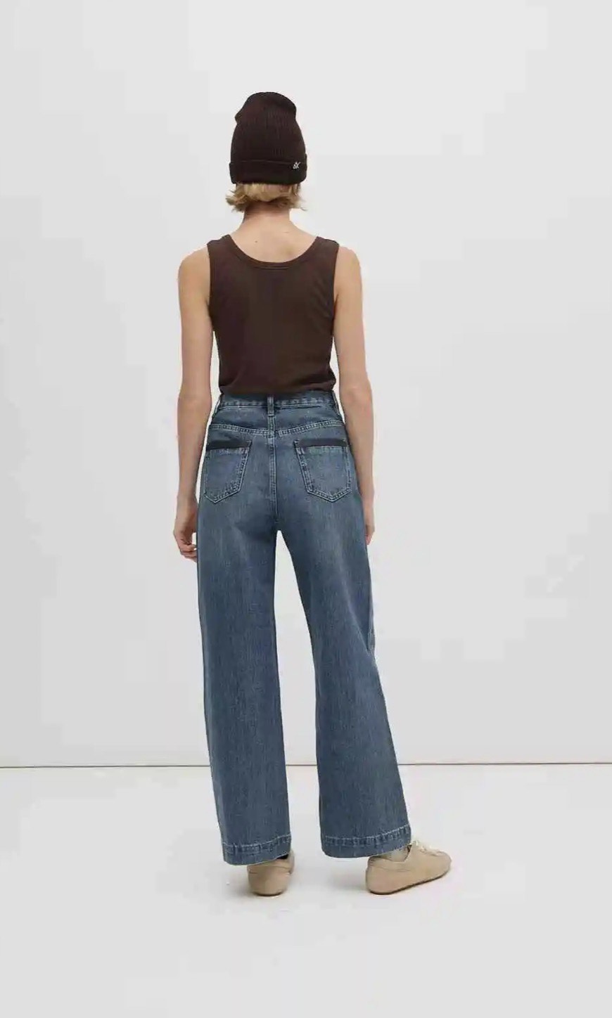 Τζιν παντελόνι με φαρδιά γραμμή σε μπλε τζιν μεσαίου μεγέθους, με μοντέρνο και ευέλικτο στυλ. Η κεντημένη λεπτομέρεια στην μπροστινή τσέπη προσθέτει μια ξεχωριστή και μοντέρνα πινελιά.