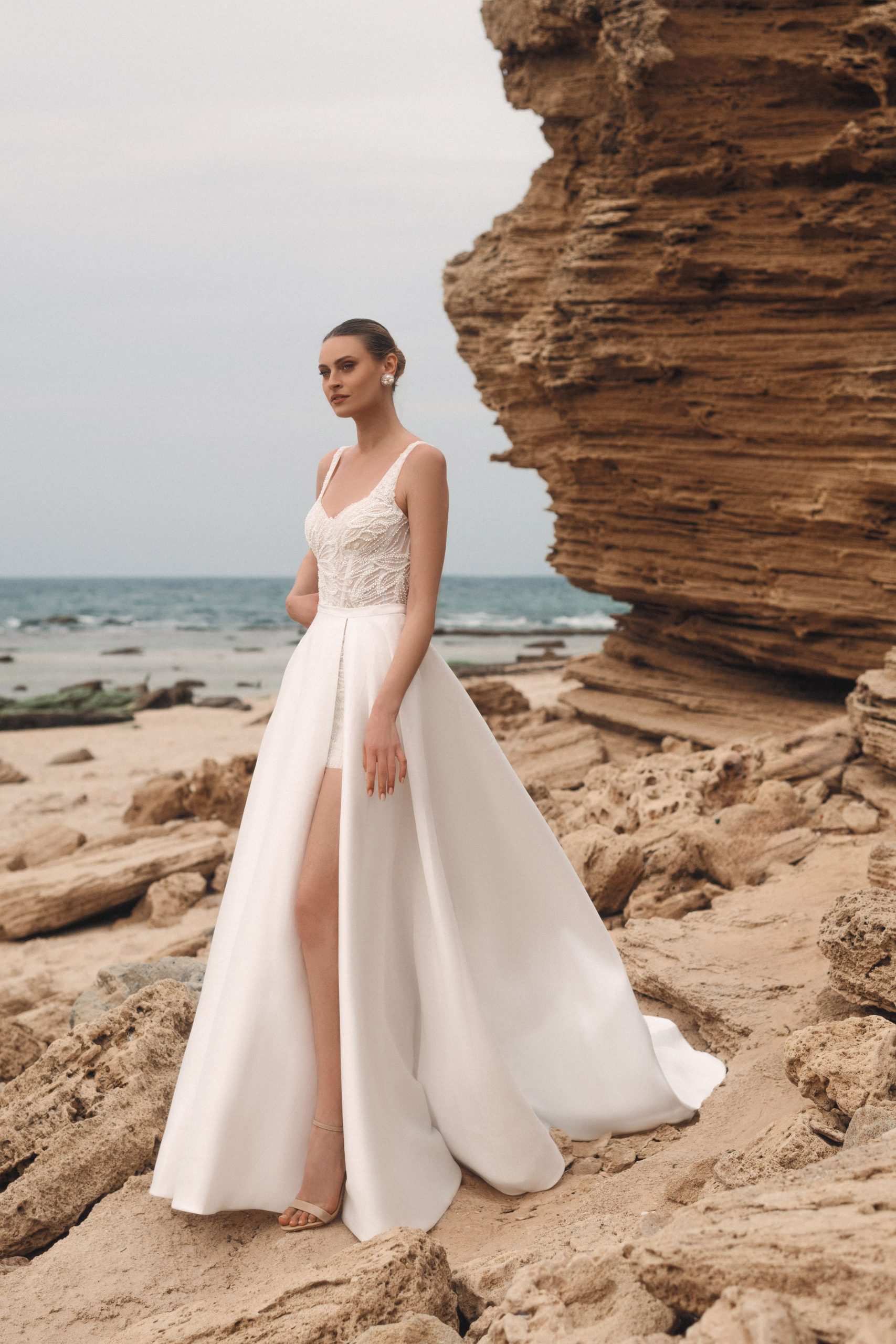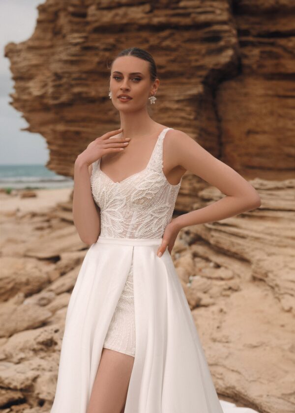 Εκπληκτικό νυφικό μίνι με φούστα πρόσθετη σε λεθκή απόχρωση από εξαιρετικό ύφασμα ταφτά.
