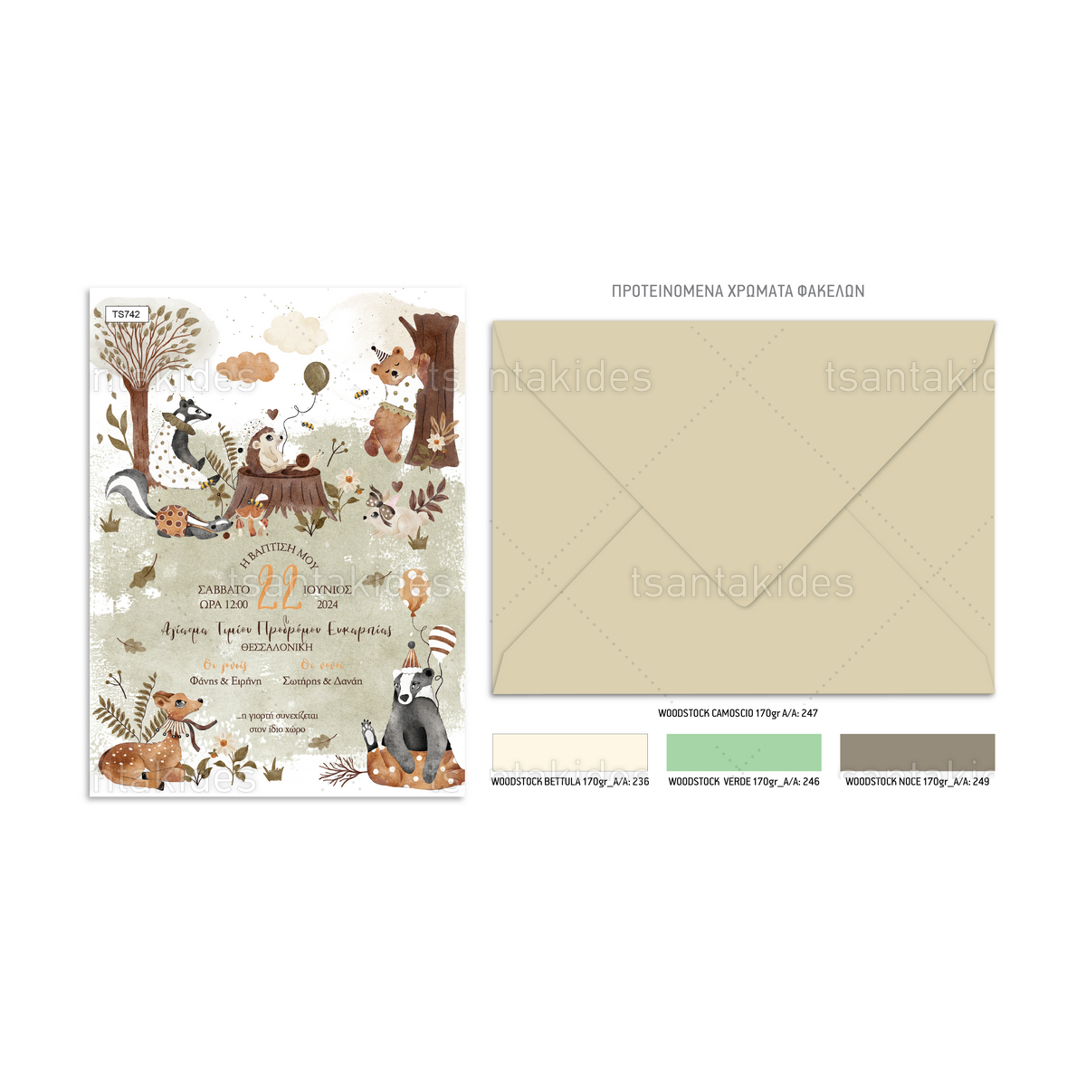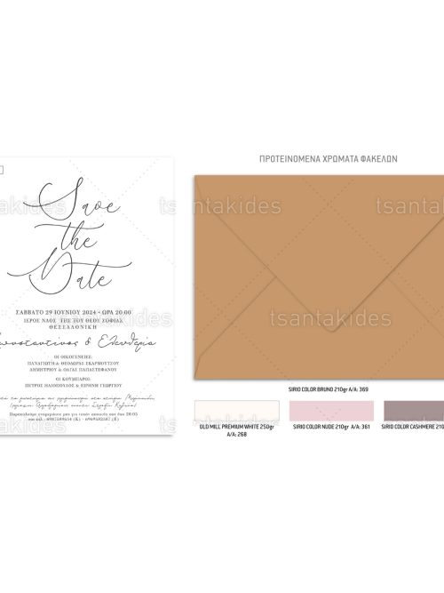Το προσκλητήριο διαθέτει φάκελο διάστασης 15x22cm σε χαρτί της επιλογής σας από τους αναγραφόμενους κωδικούς.