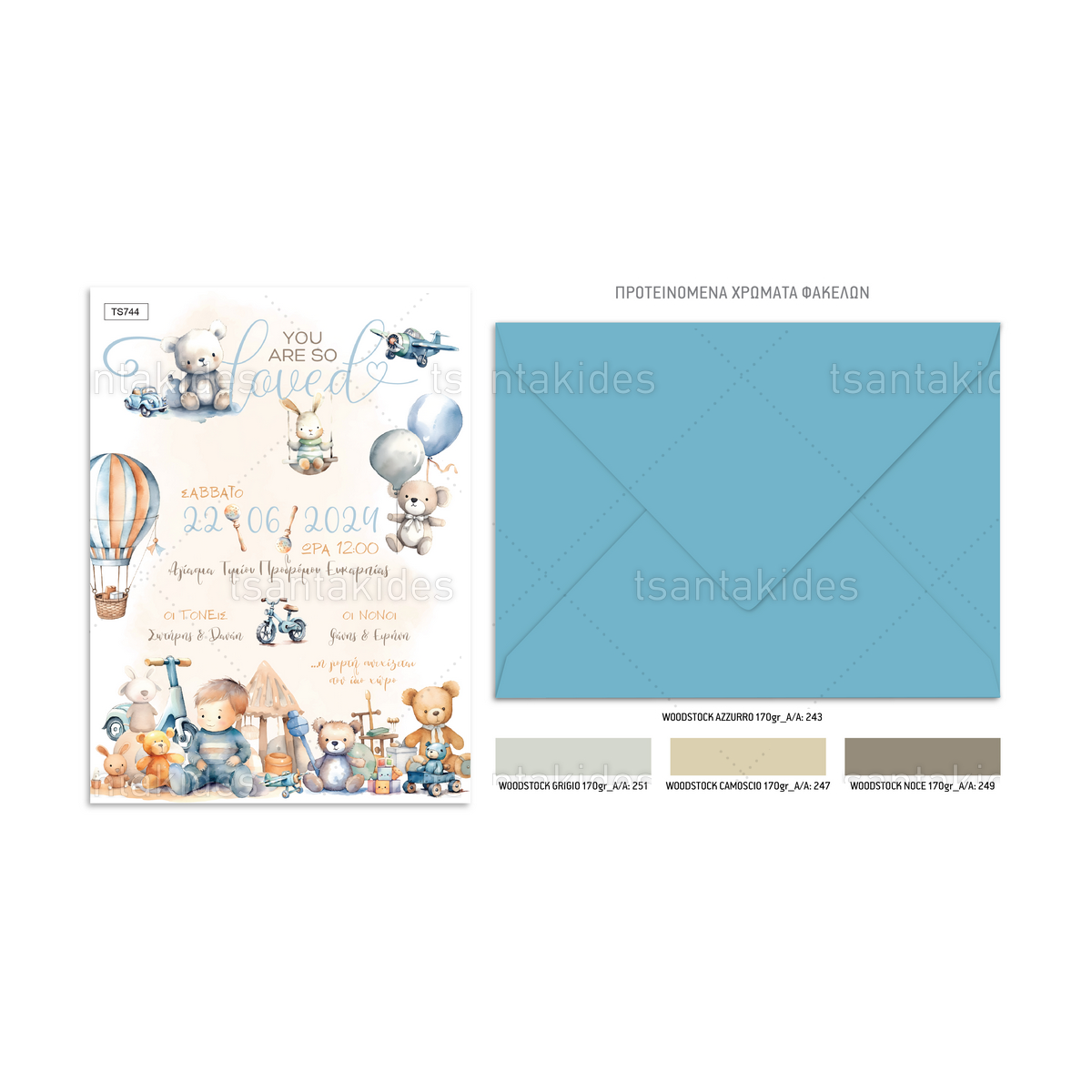 Το προσκλητήριο διαθέτει φάκελο διάστασης 15x22cm σε χαρτί της επιλογής σας από τους αναγραφόμενους κωδικούς.