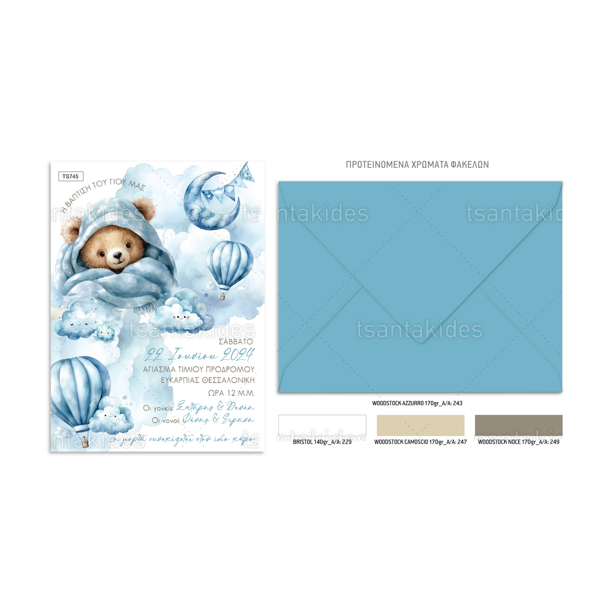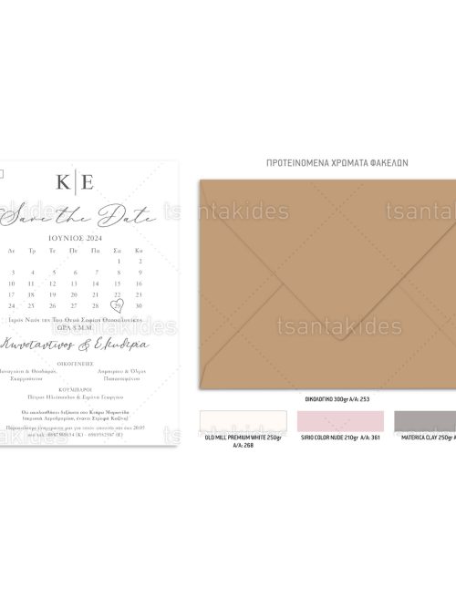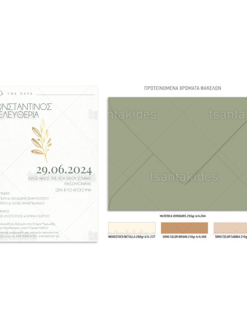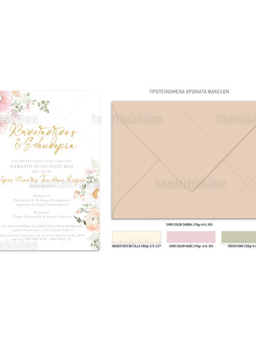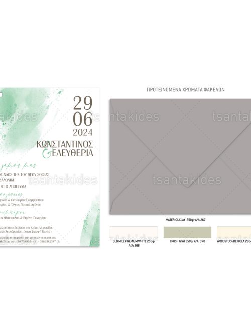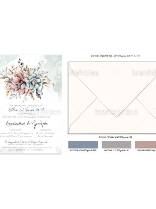 Το προσκλητήριο διαθέτει φάκελο διάστασης 15x22cm σε χαρτί της επιλογής σας από τους αναγραφόμενους κωδικούς.