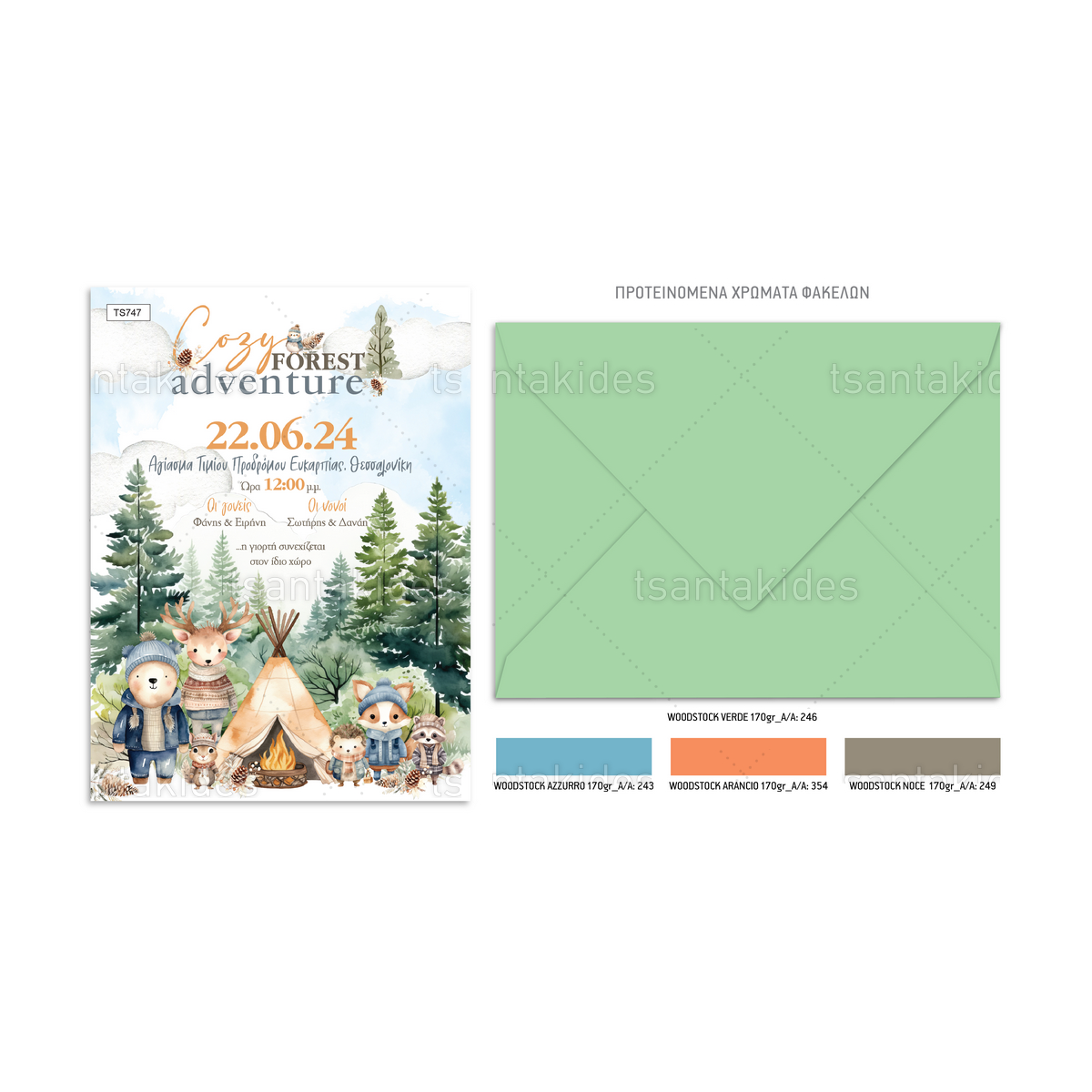 Το προσκλητήριο διαθέτει φάκελο διάστασης 15x22cm σε χαρτί της επιλογής σας από τους αναγραφόμενους κωδικούς.