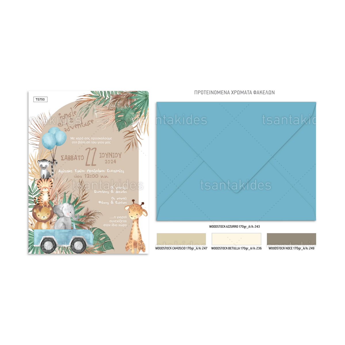 Το προσκλητήριο διαθέτει φάκελο διάστασης 15x22cm σε χαρτί της επιλογής σας από τους αναγραφόμενους κωδικούς.