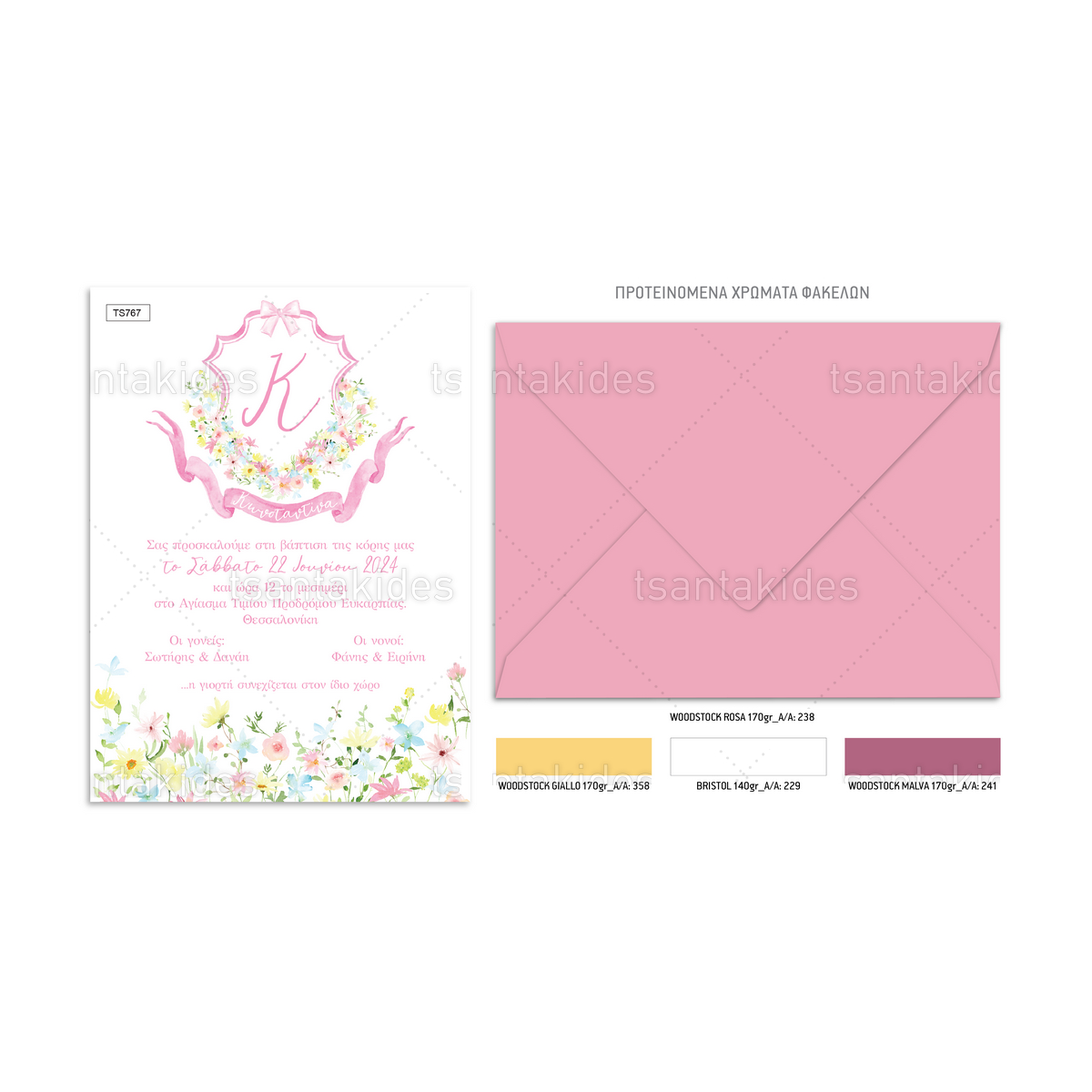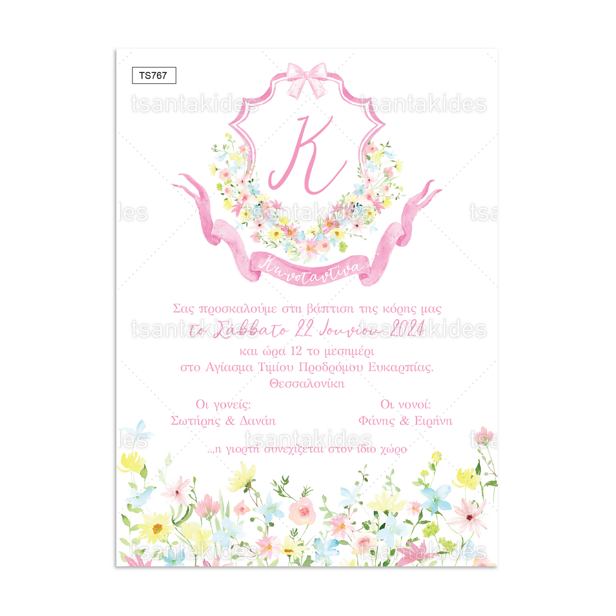 Προσκλητήριο βάπτισης με θέμα λουλούδια με μονόγραμμα