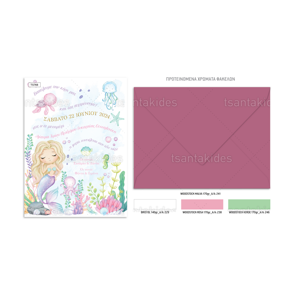 Το προσκλητήριο διαθέτει φάκελο διάστασης 15x22cm σε χαρτί της επιλογής σας από τους αναγραφόμενους κωδικούς.