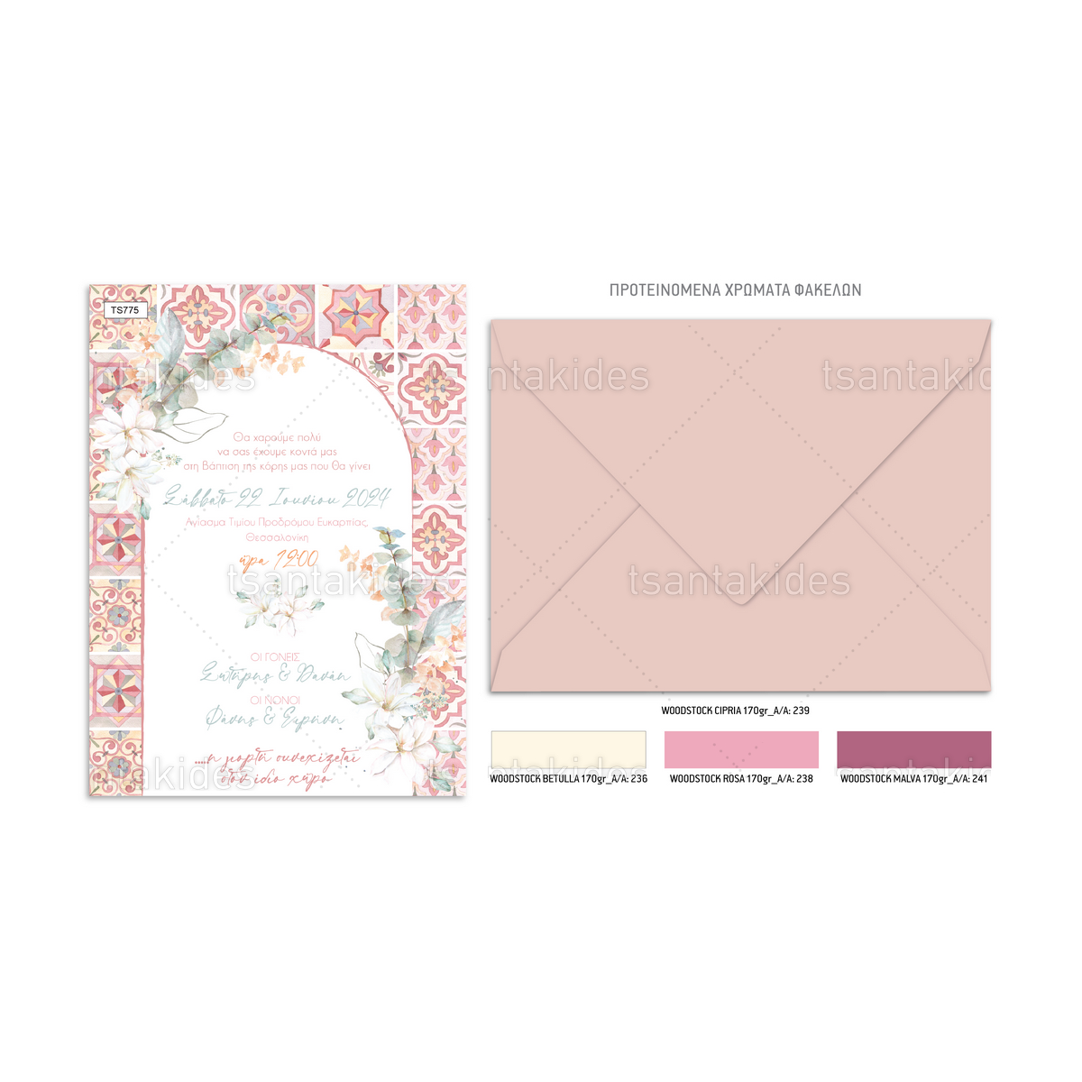 Το προσκλητήριο διαθέτει φάκελο διάστασης 15x22cm σε χαρτί της επιλογής σας από τους αναγραφόμενους κωδικούς.