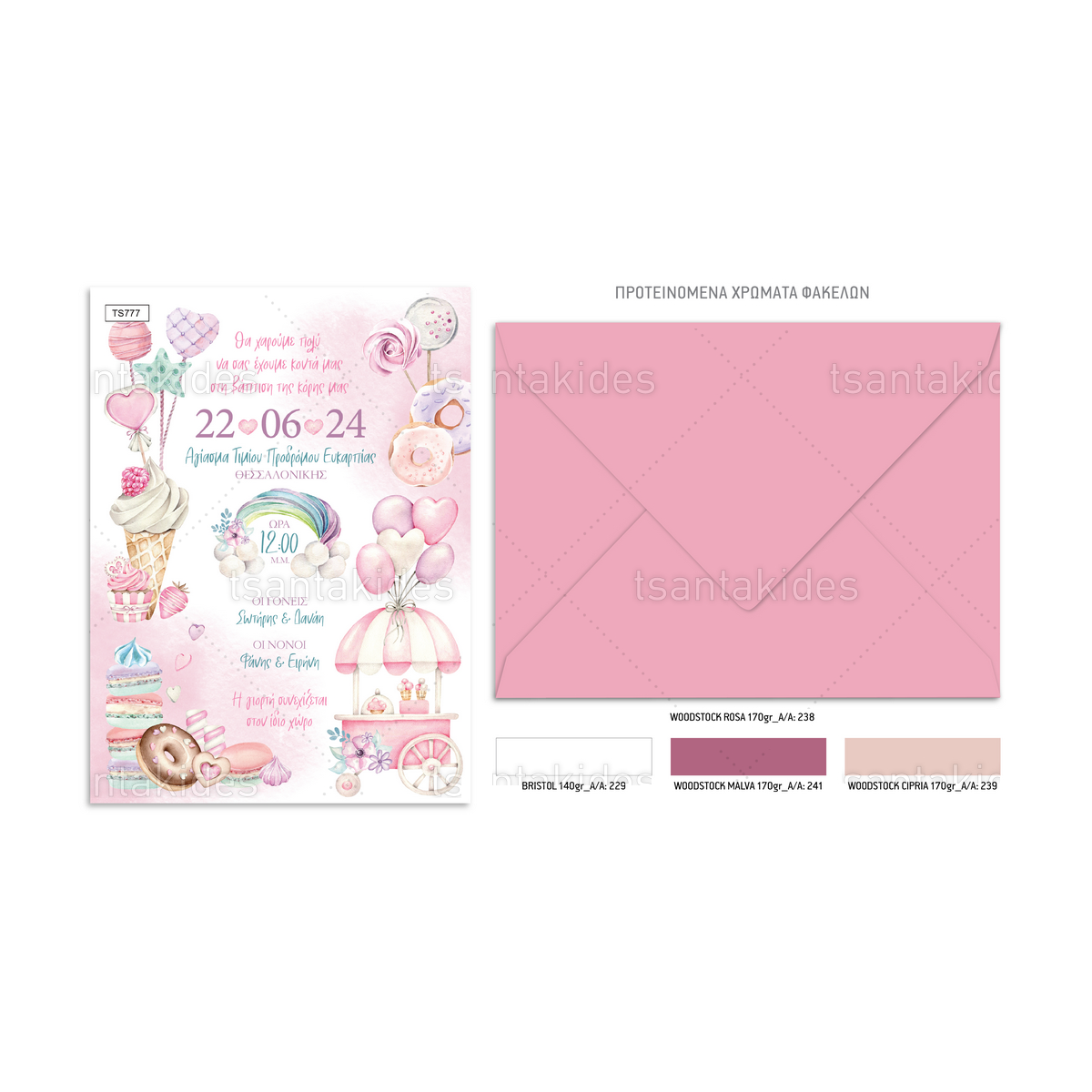 Το προσκλητήριο διαθέτει φάκελο διάστασης 15x22cm σε χαρτί της επιλογής σας από τους αναγραφόμενους κωδικούς.