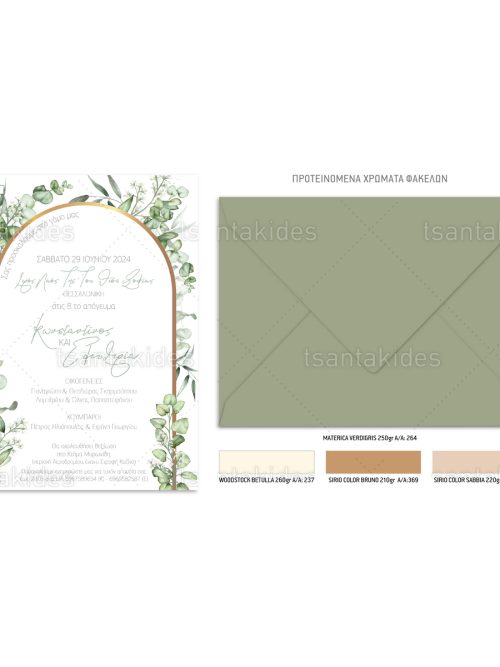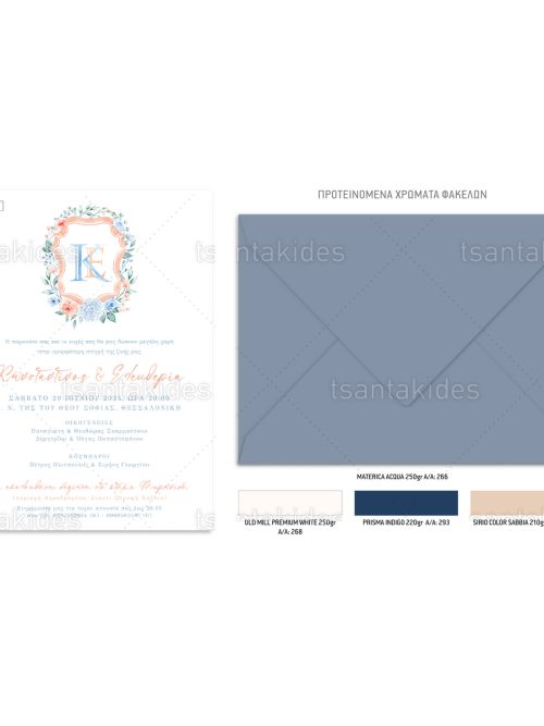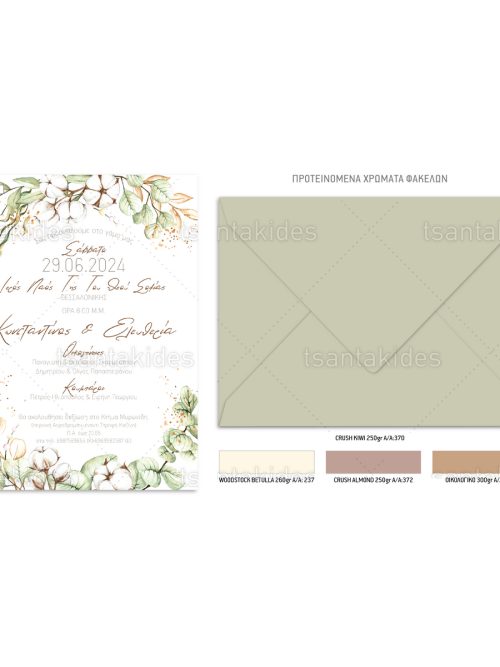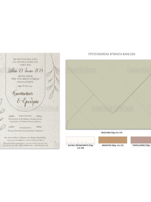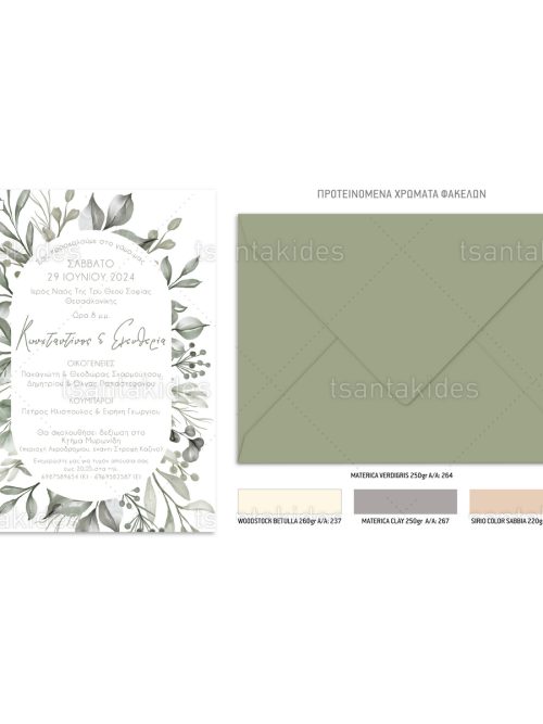 Το προσκλητήριο διαθέτει φάκελο διάστασης 15x22cm σε χαρτί της επιλογής σας από τους αναγραφόμενους κωδικούς.