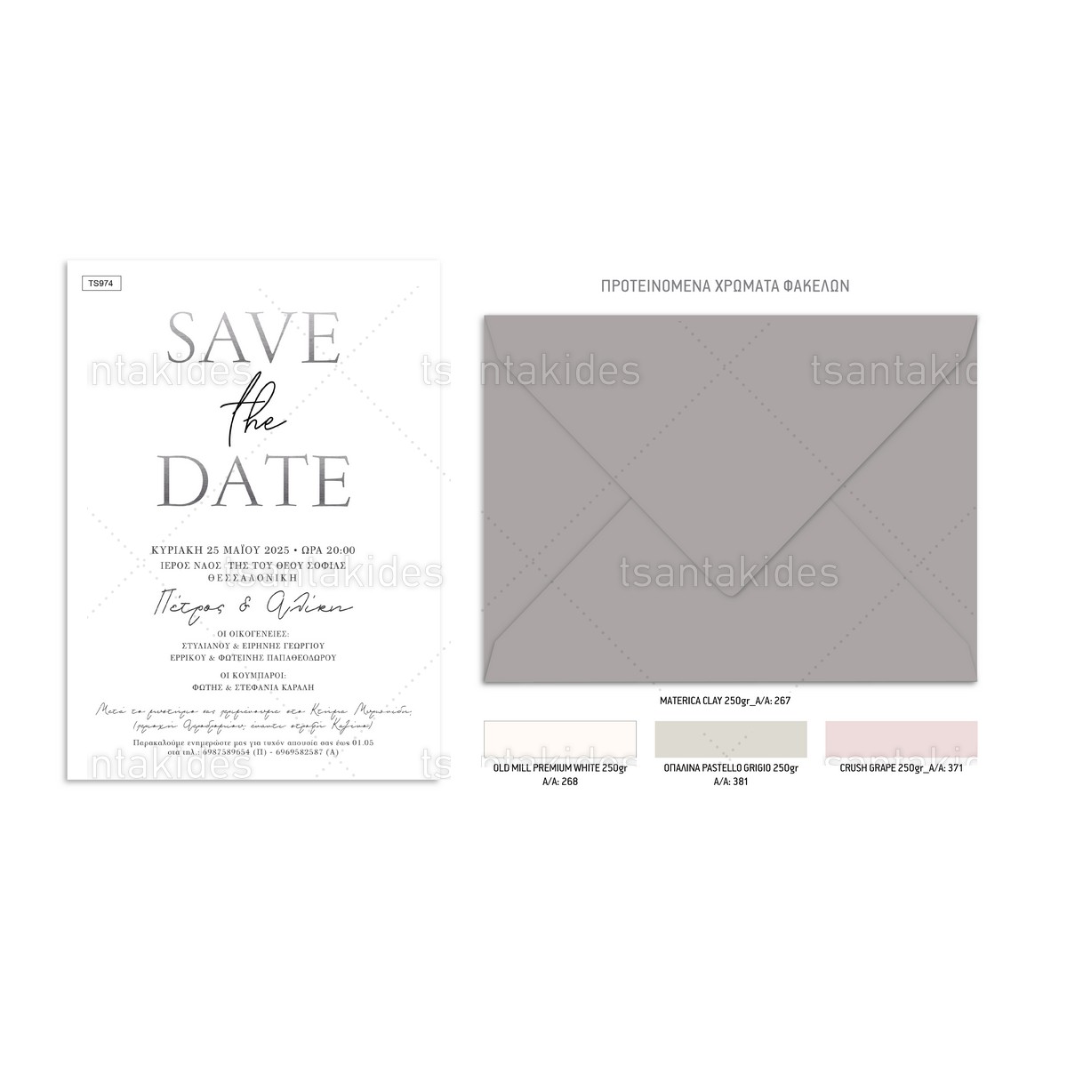Το προσκλητήριο διαθέτει φάκελο διάστασης 15x22cm σε χαρτί της επιλογής σας από τους αναγραφόμενους κωδικούς.