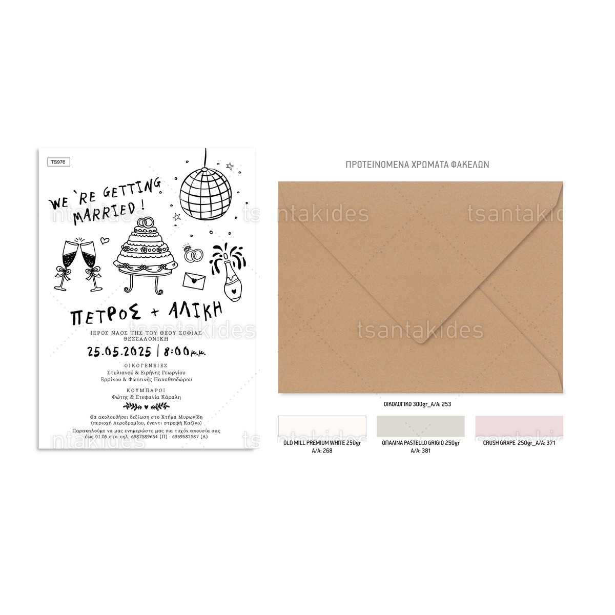Το προσκλητήριο διαθέτει φάκελο διάστασης 15x22cm σε χαρτί της επιλογής σας από τους αναγραφόμενους κωδικούς.