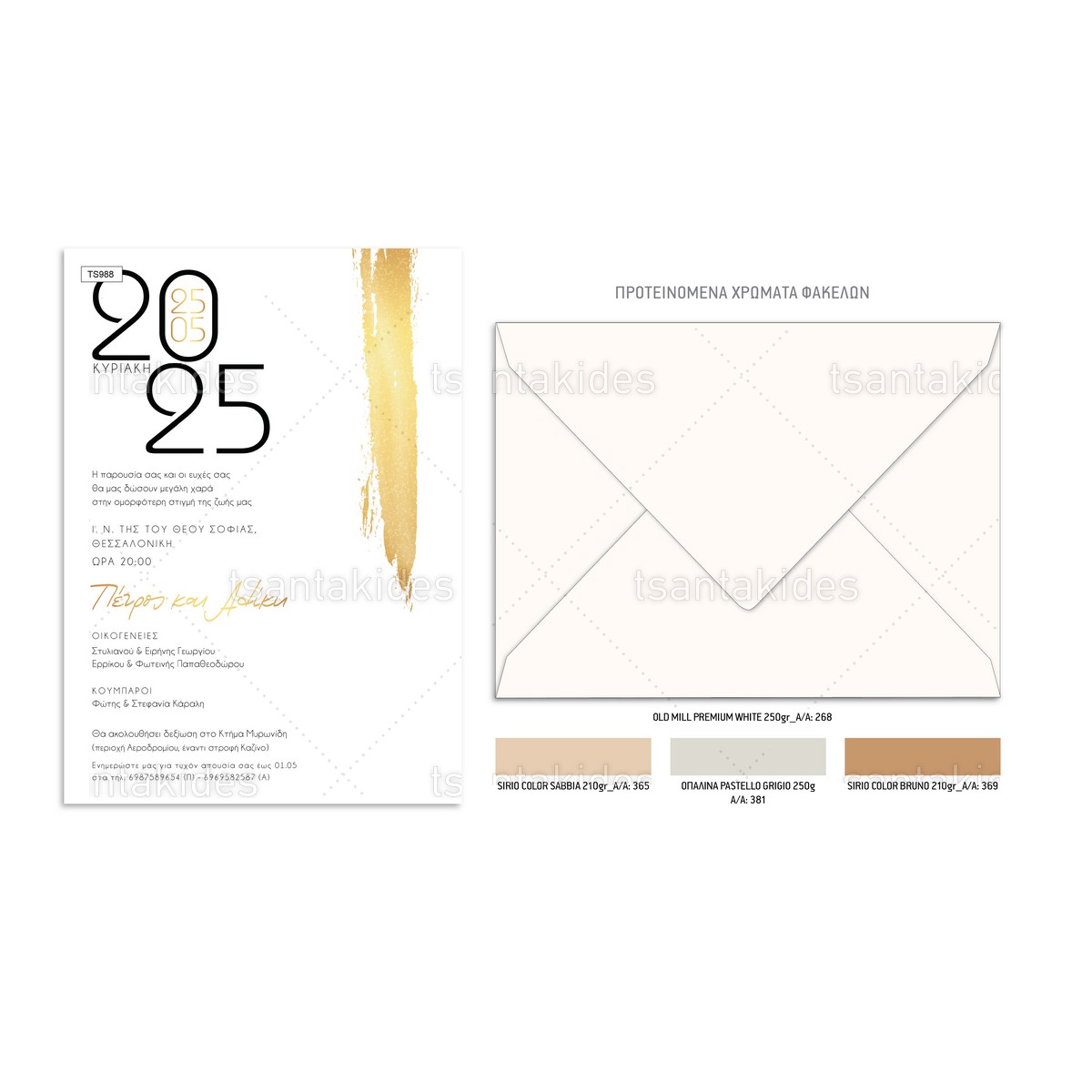 Το προσκλητήριο διαθέτει φάκελο διάστασης 15x22cm σε χαρτί της επιλογής σας από τους αναγραφόμενους κωδικούς.